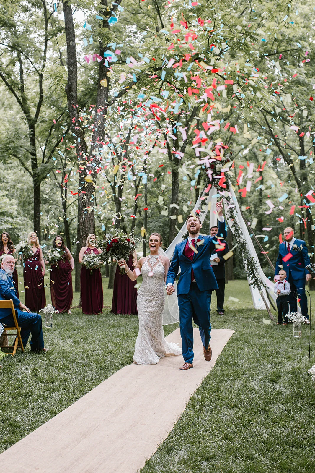 On June 8th, Kevin and Emily made a bang in the Lost Hill Lake walnut grove. Before the ceremony, Emily and her bridesmaids got ready at our preferred vendor Budget Lodging's bridal suite while Kevin and the groomsmen buttoned up their suits in the Budget Lodging’s cottage. Preferred vendor SisterChicks Flowers and More created Emily’s beautiful bouquet, the gorgeous teepee topper, whiskey barrel arrangements, dessert table decoration and baby’s breath accents down the aisle as well as on the dinner tables. Our favorite personal touch from Kevin and Emily’s wedding was the St. Louis Blues rally towels the entire wedding party added to their reception introductions. The couples big day was during the Stanley Cup Finals and this was a fun way for the couple to incorporate the excitement and pride the entire city was feeling for the team. All of these magical memories below were captured by A. Gillardi Photo.