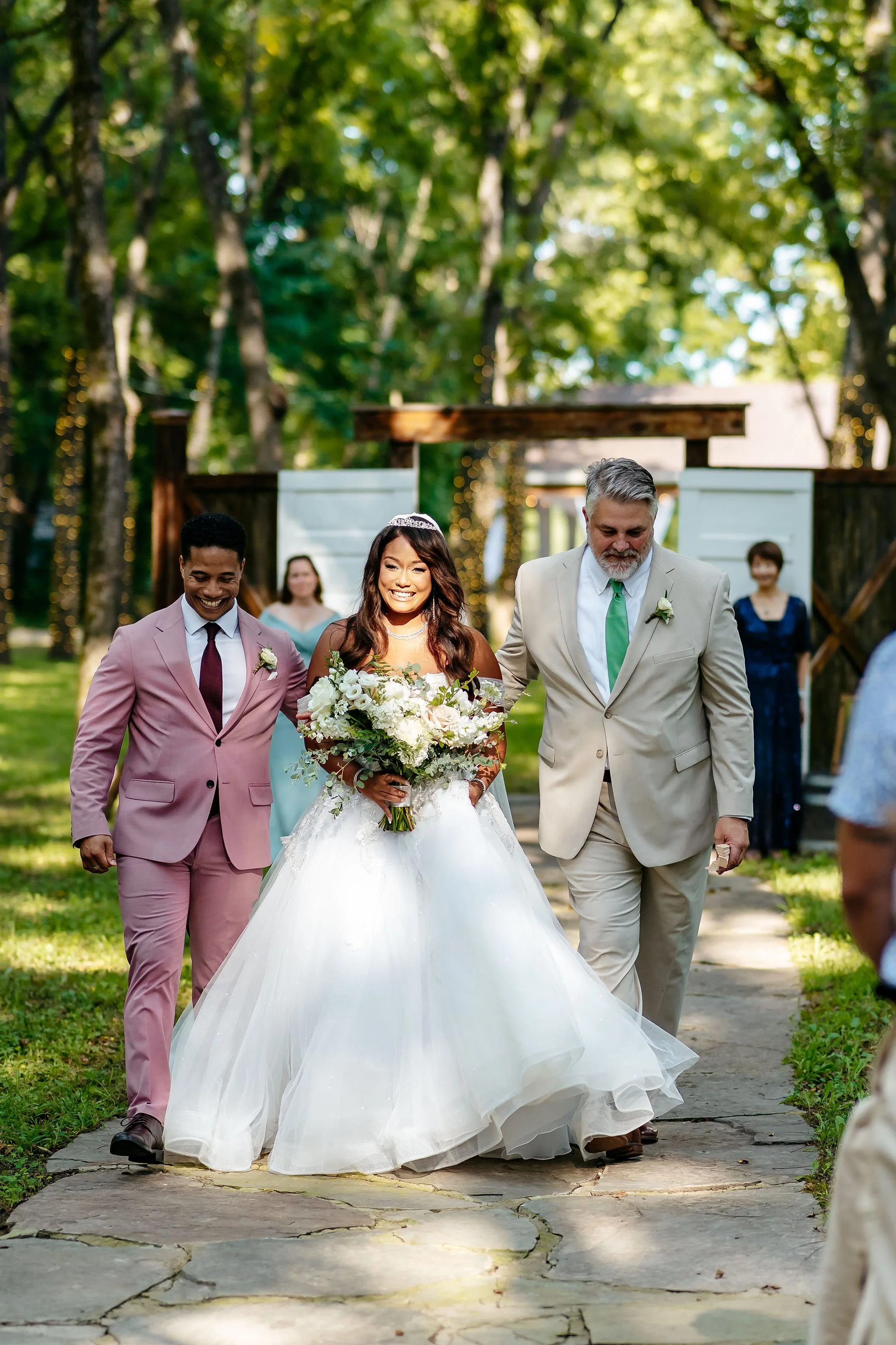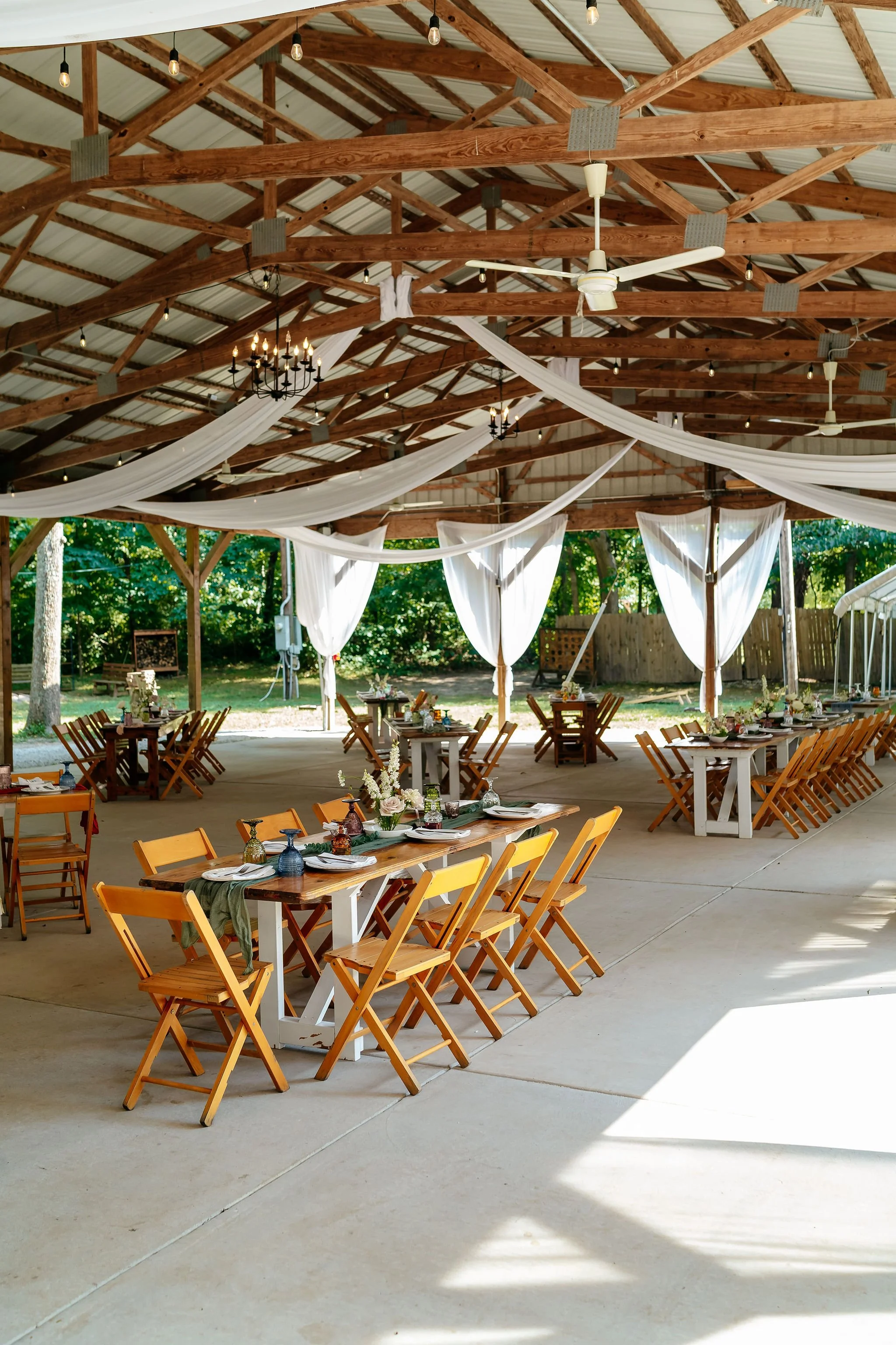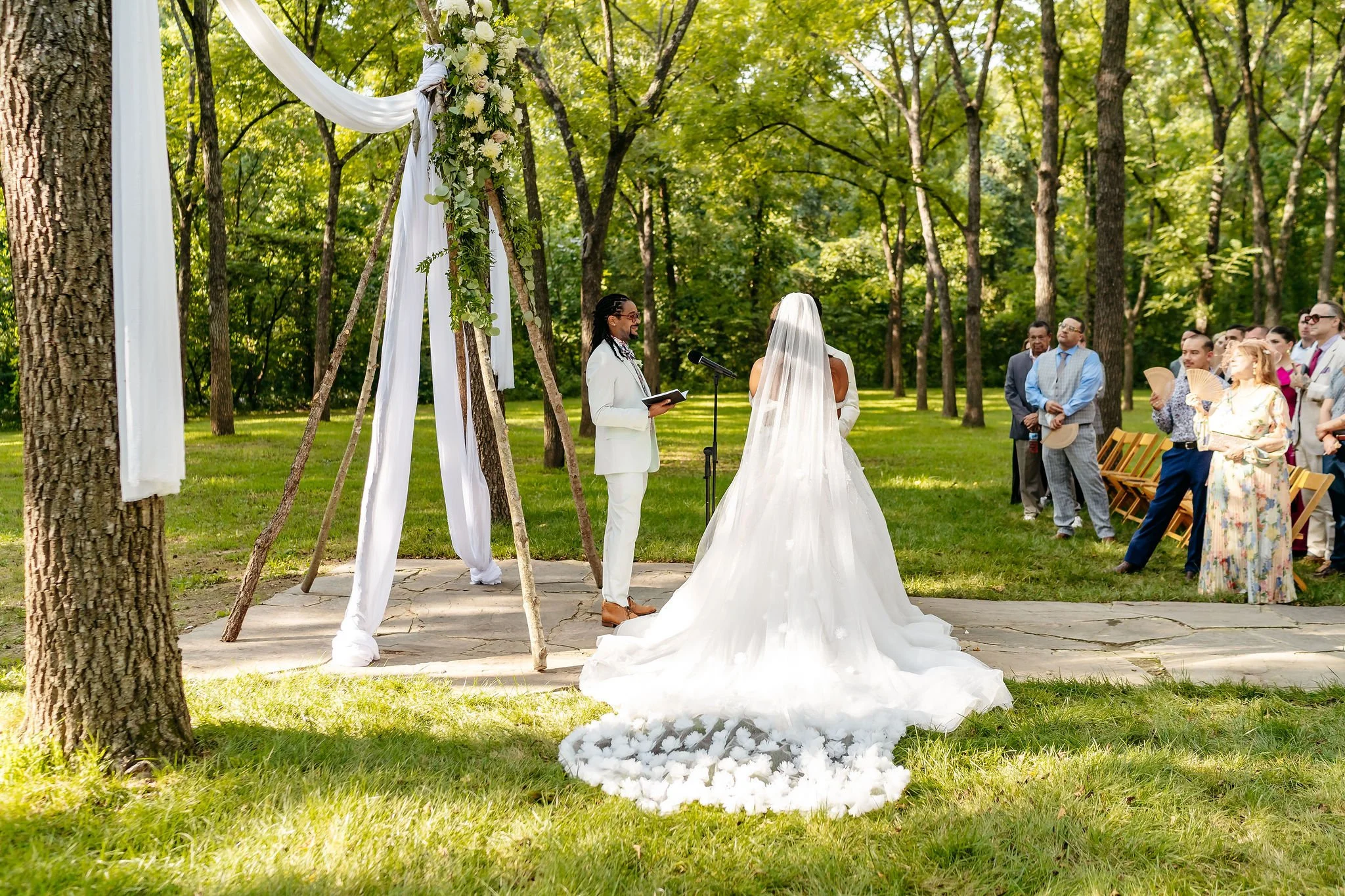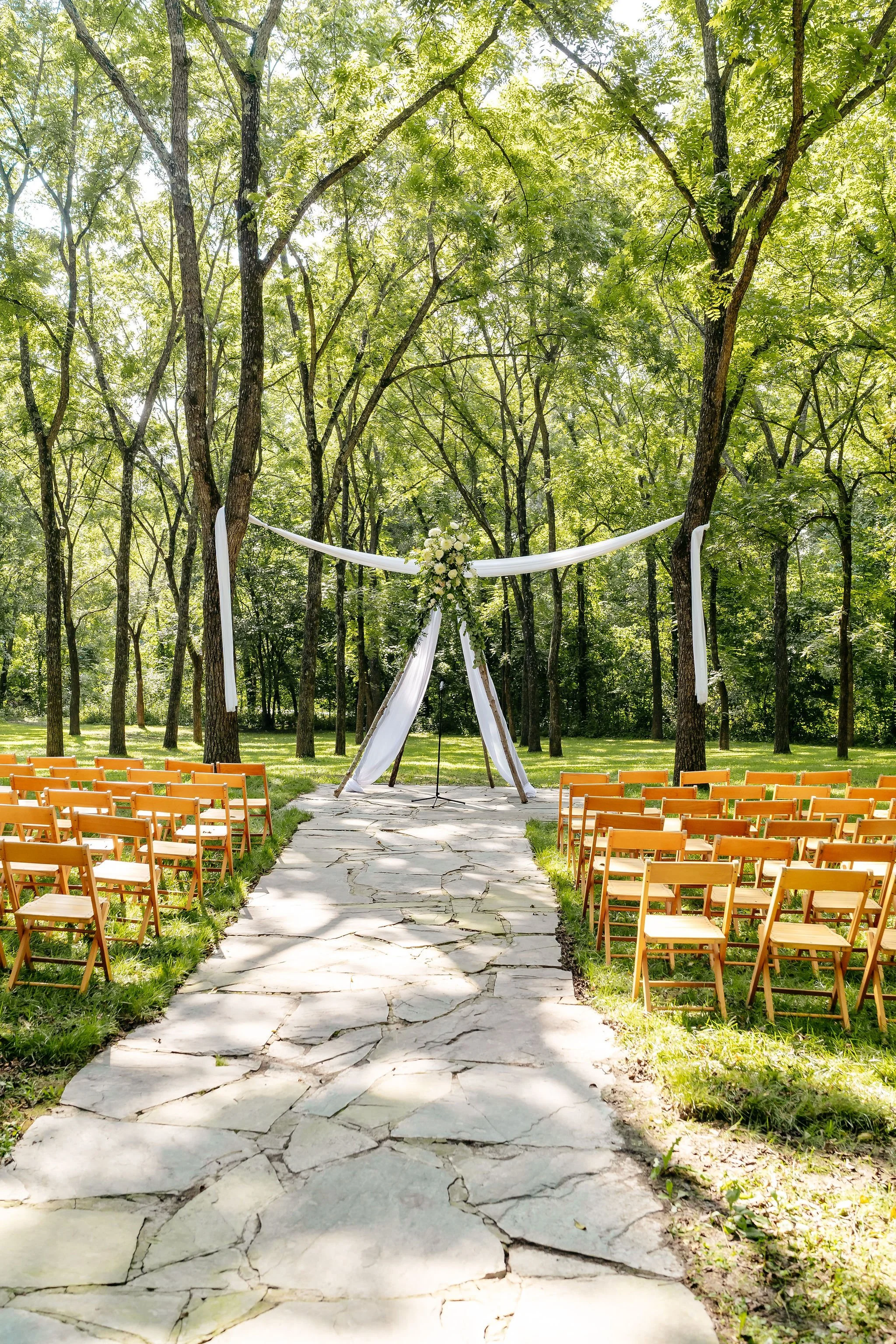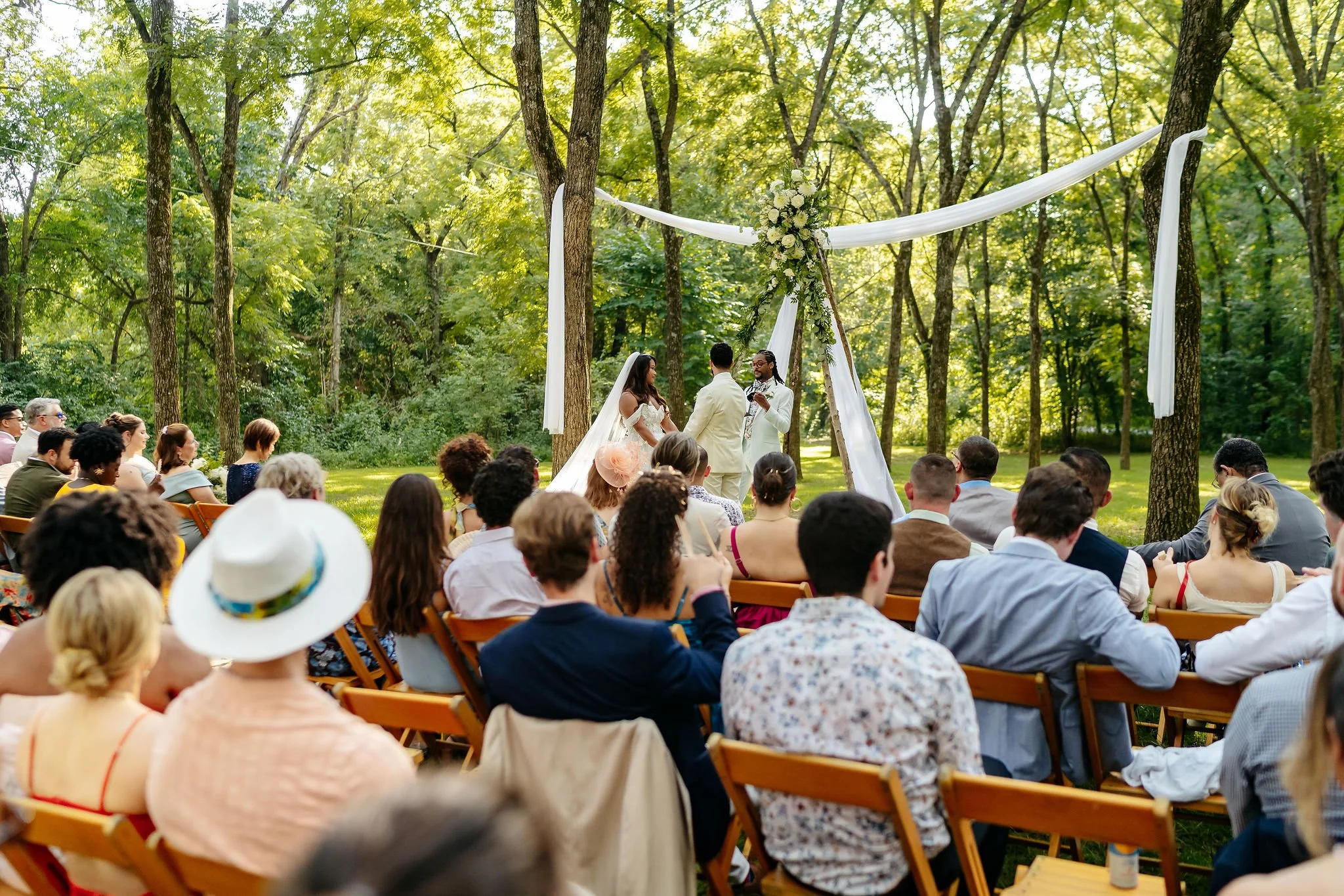 As guests arrived by shuttle, they were welcomed into the forest for a ceremony in our Walnut Grove. Soft chiffon draped through the trees, natural textures lined the aisle, and the space felt warm, personal, and grounded.