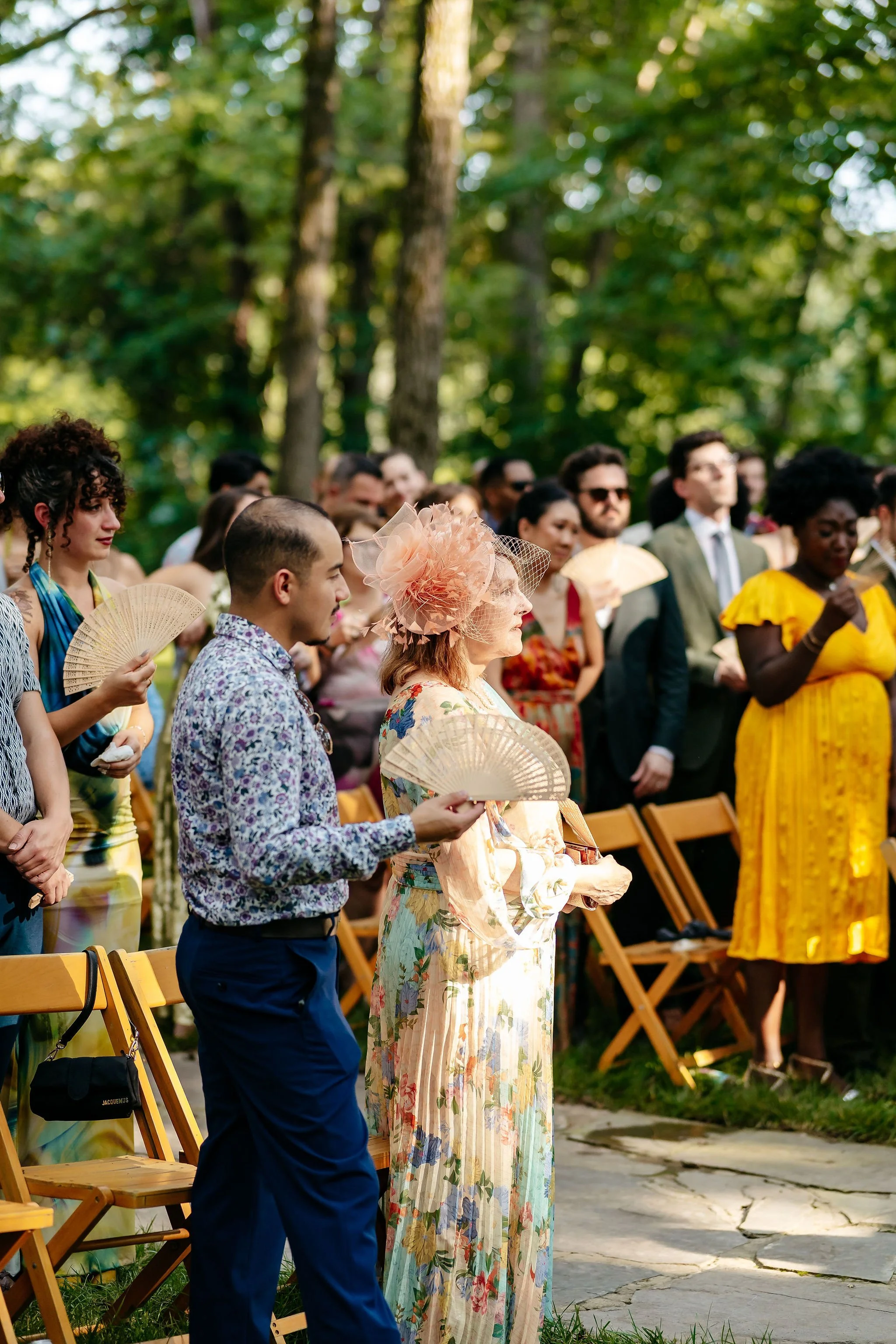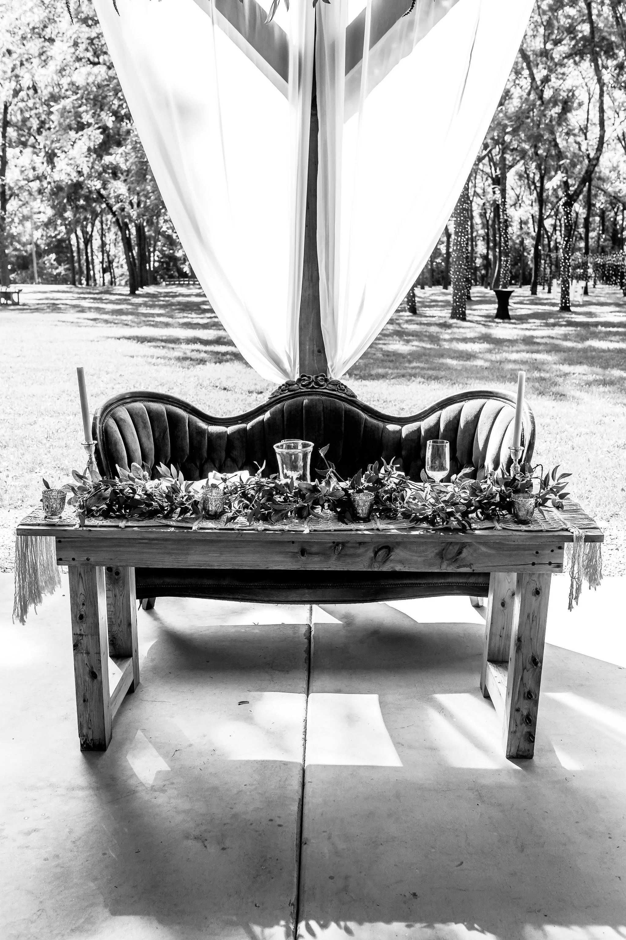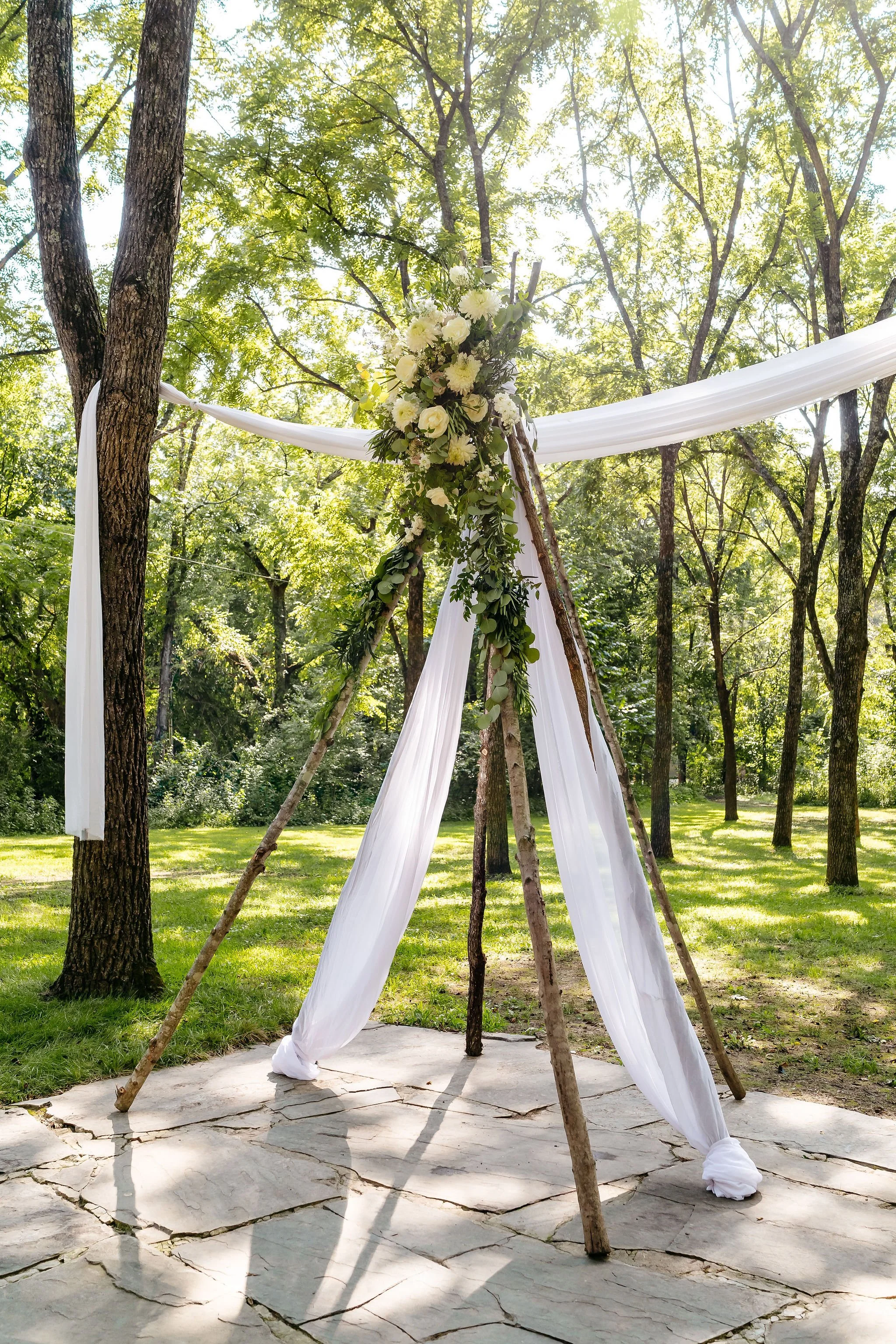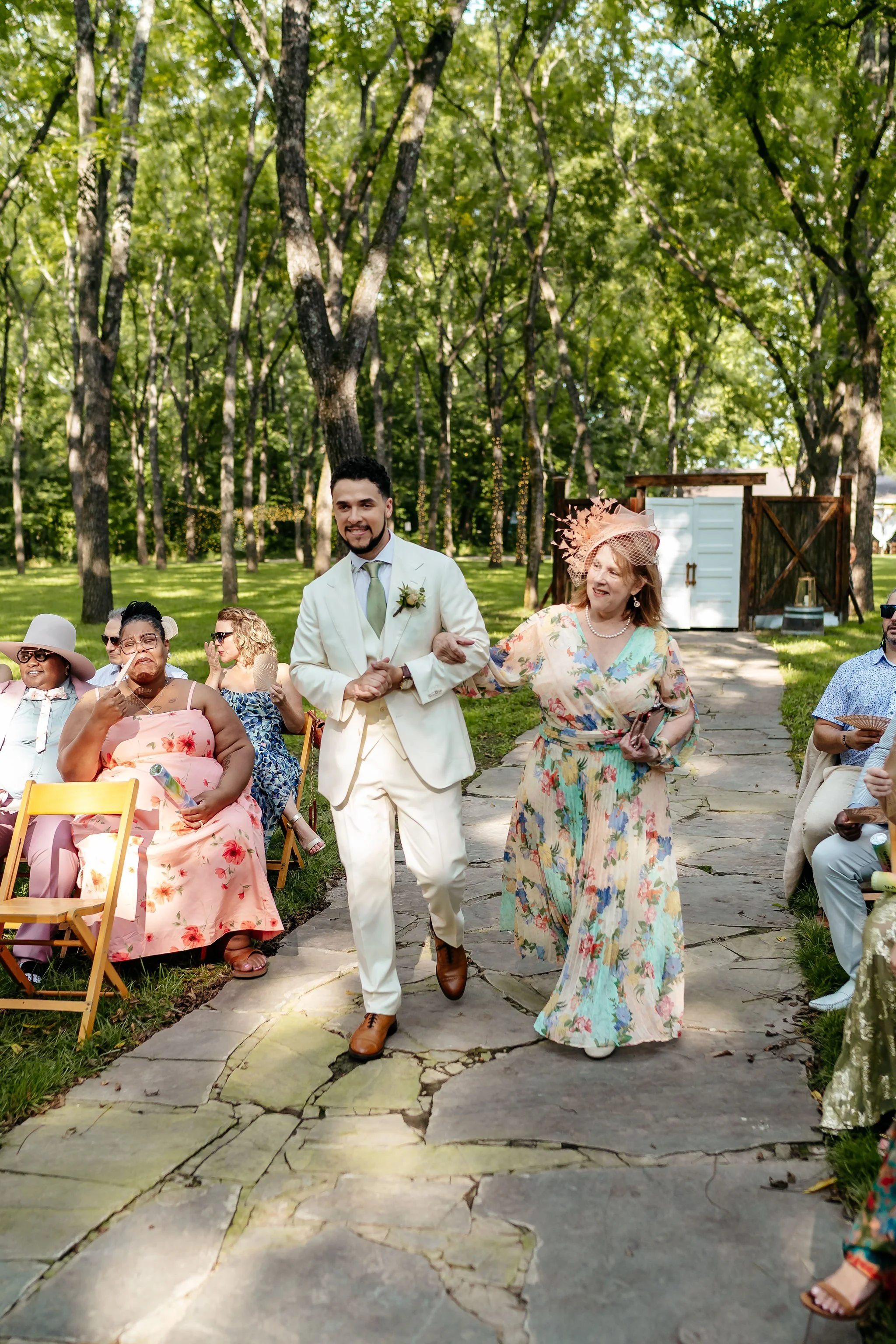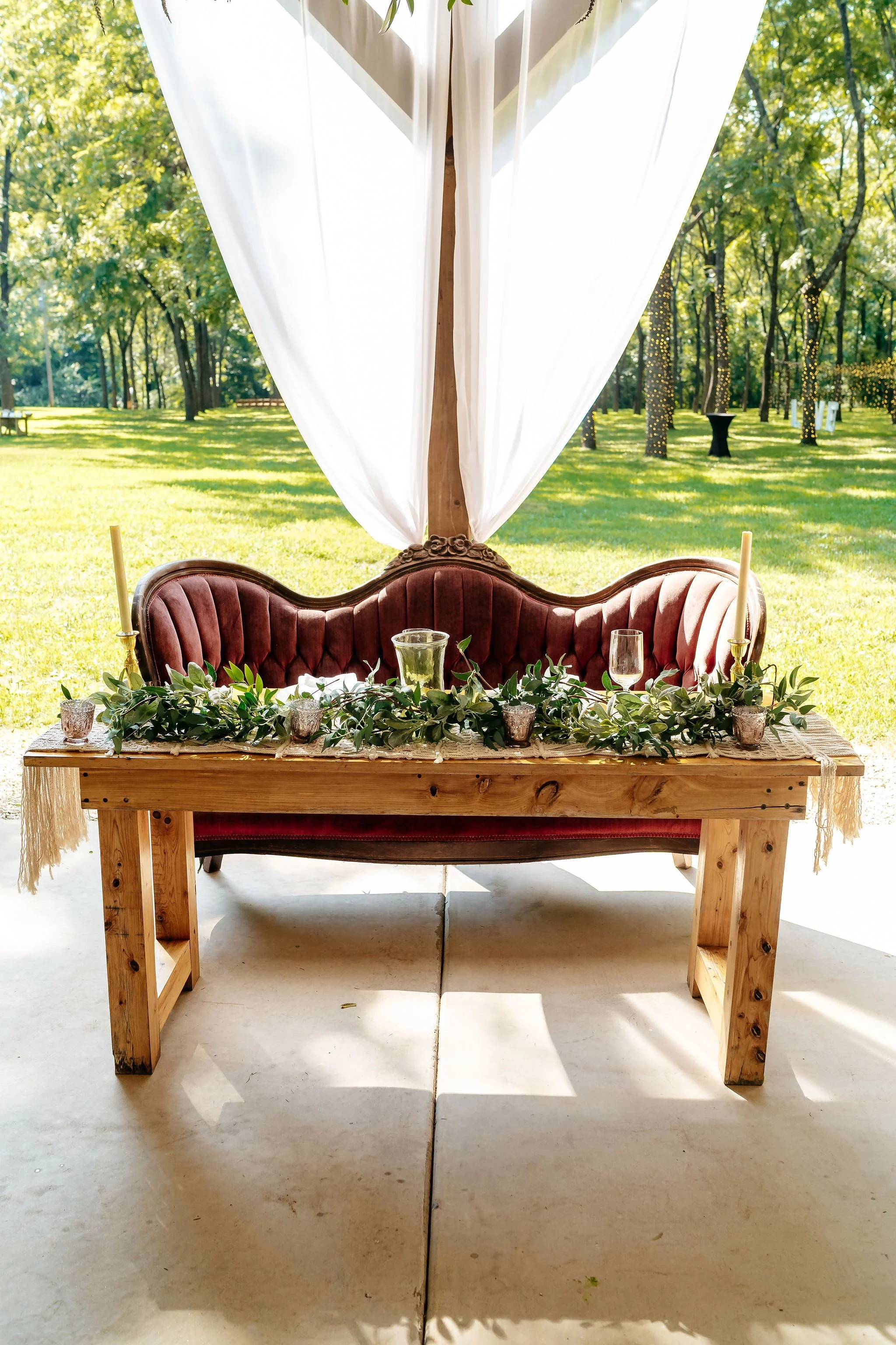 As guests arrived by shuttle, they were welcomed into the forest for a ceremony in our Walnut Grove. Soft chiffon draped through the trees, natural textures lined the aisle, and the space felt warm, personal, and grounded.