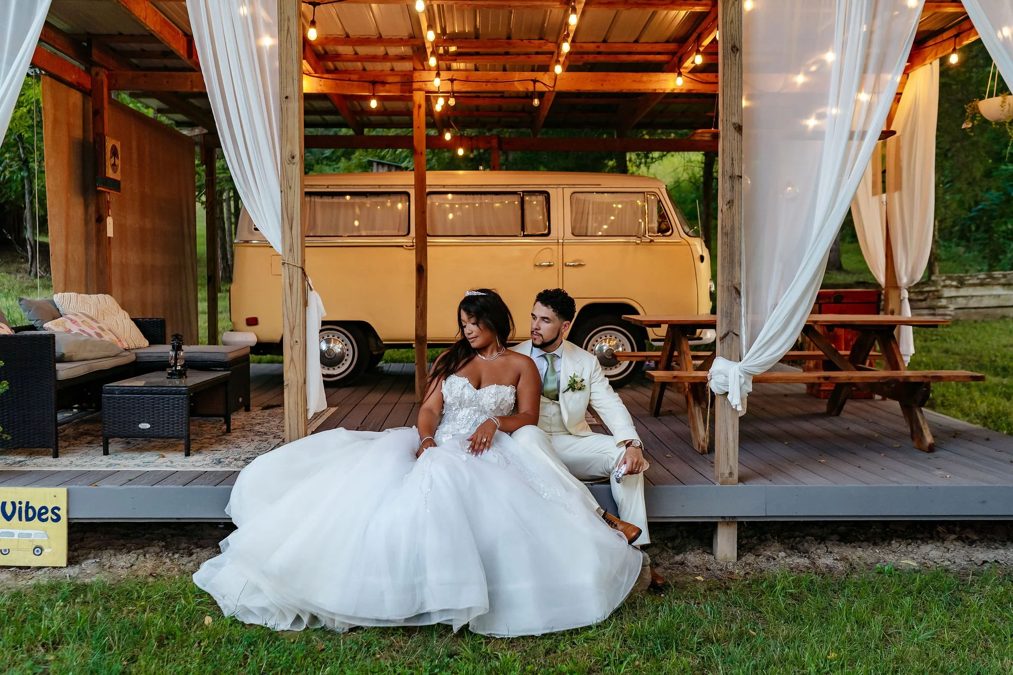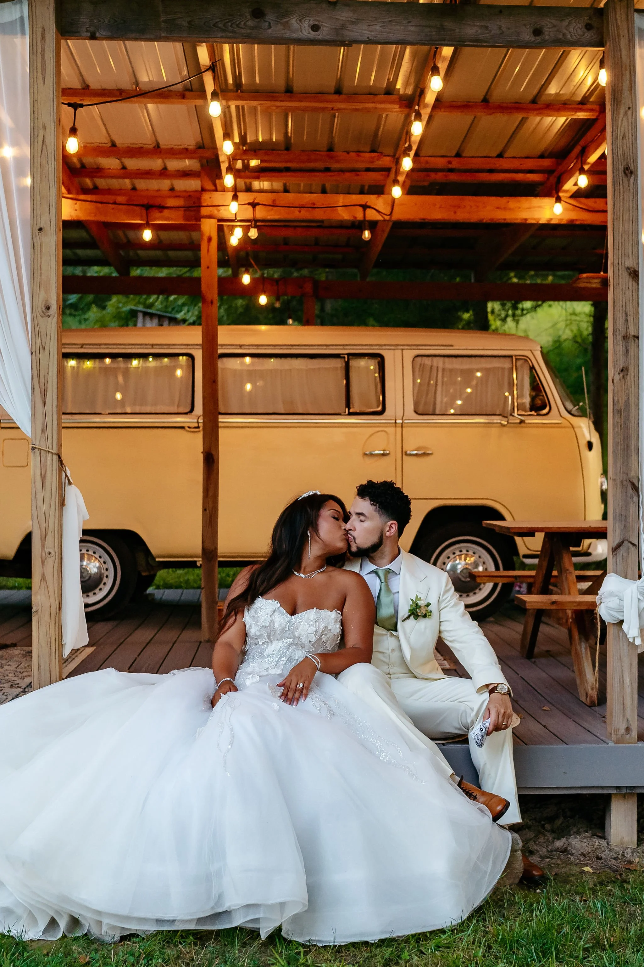 After the ceremony and family photos, Aya and Sinclair slipped away for sunset photos near the lakeside bridge, Thinking Rock, and even swung by the Good Vibes VW Bus glamper for some gorgeous photos. Soon after, speeches from loved ones, first dances, and a surprise family performance filled the evening with laughter and happy tears.