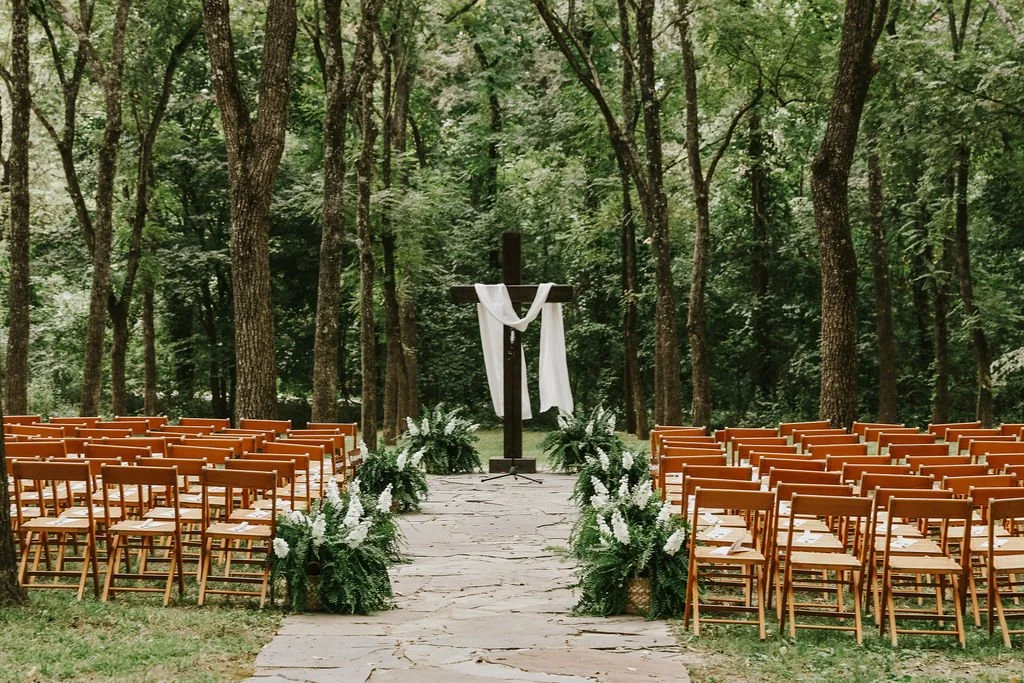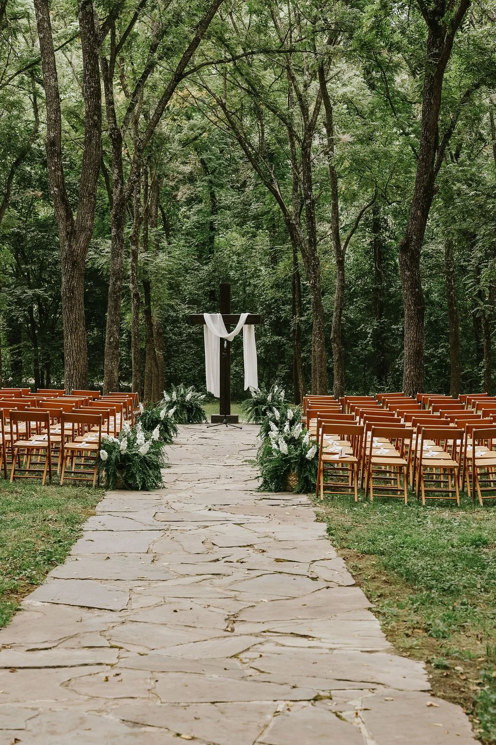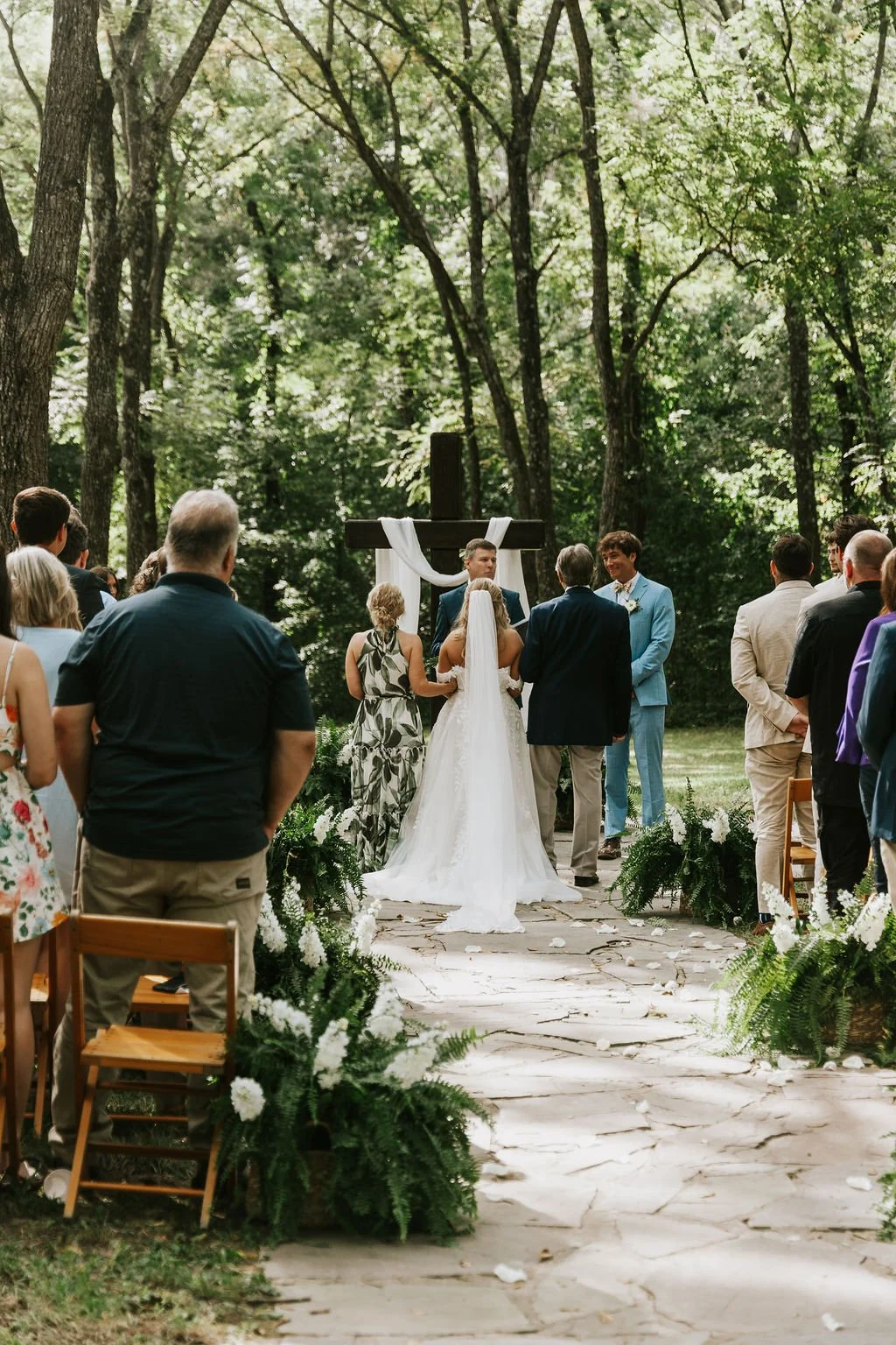 By mid-afternoon, guests began to gather at the Walnut Grove, where our stunning cross arbor draped in soft white chiffon created a beautiful focal point for the ceremony. Ferns lined the aisle, and whiskey barrels welcomed guests at the entrance, setting the tone for a natural, elegant setting.