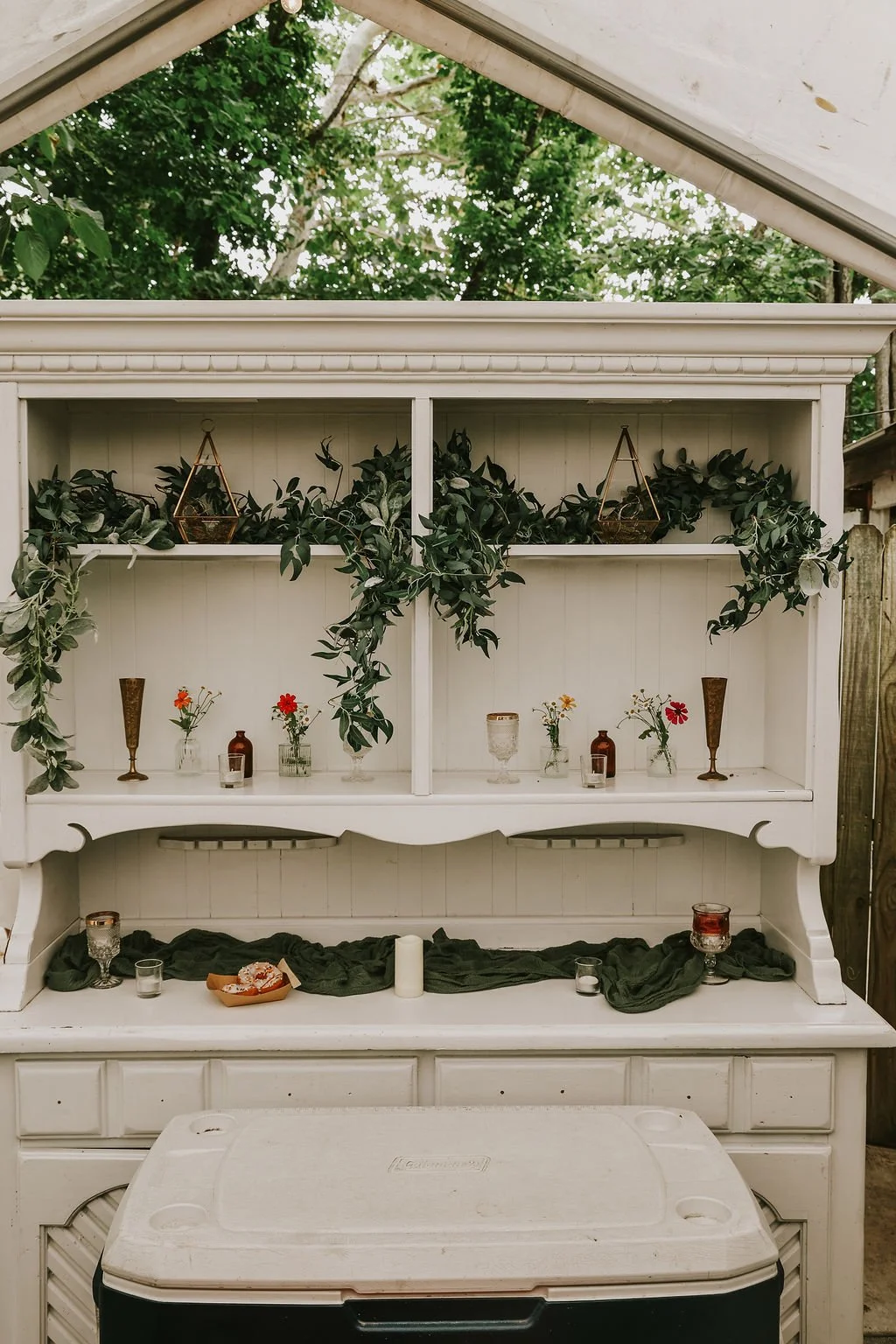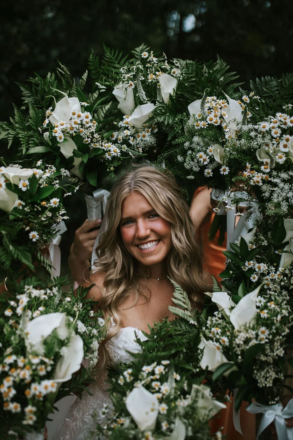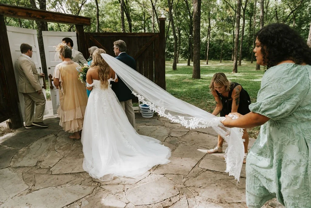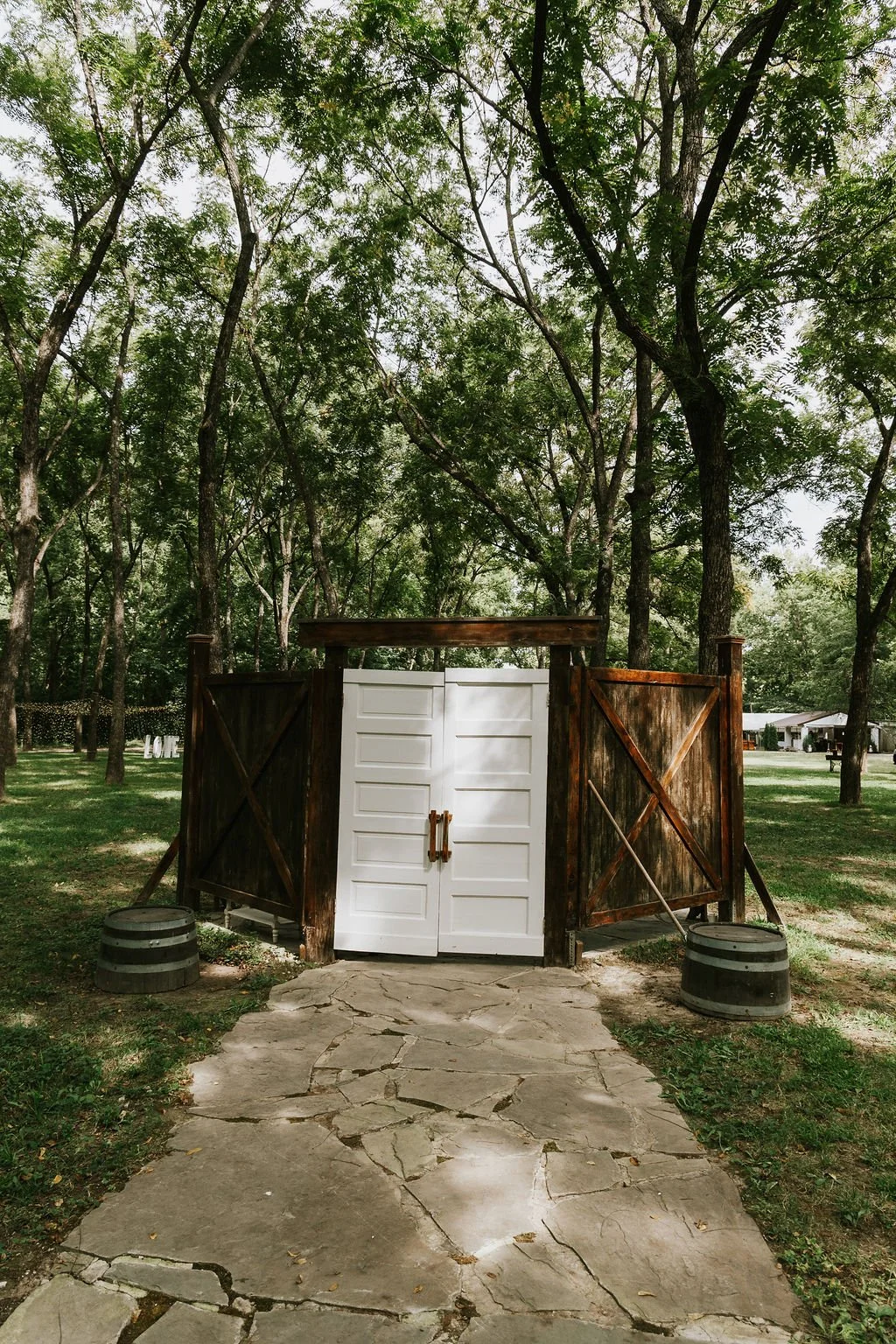 By mid-afternoon, guests began to gather at the Walnut Grove, where our stunning cross arbor draped in soft white chiffon created a beautiful focal point for the ceremony. Ferns lined the aisle, and whiskey barrels welcomed guests at the entrance, setting the tone for a natural, elegant setting.