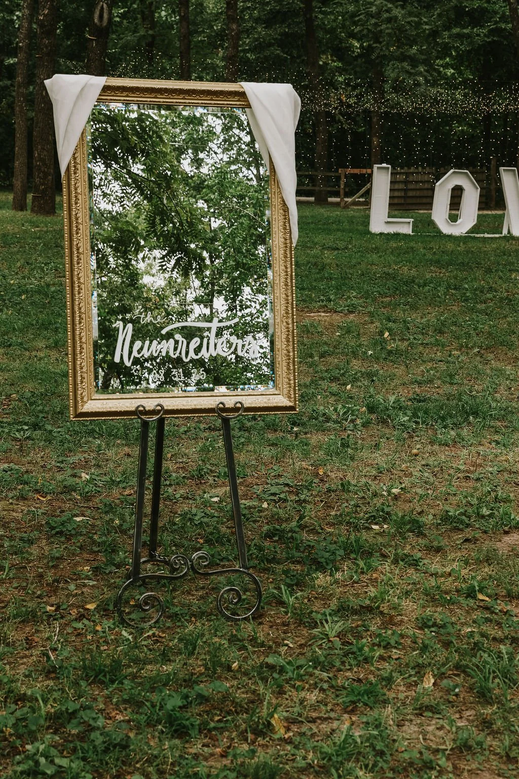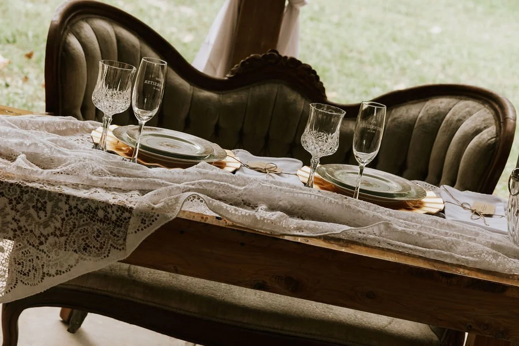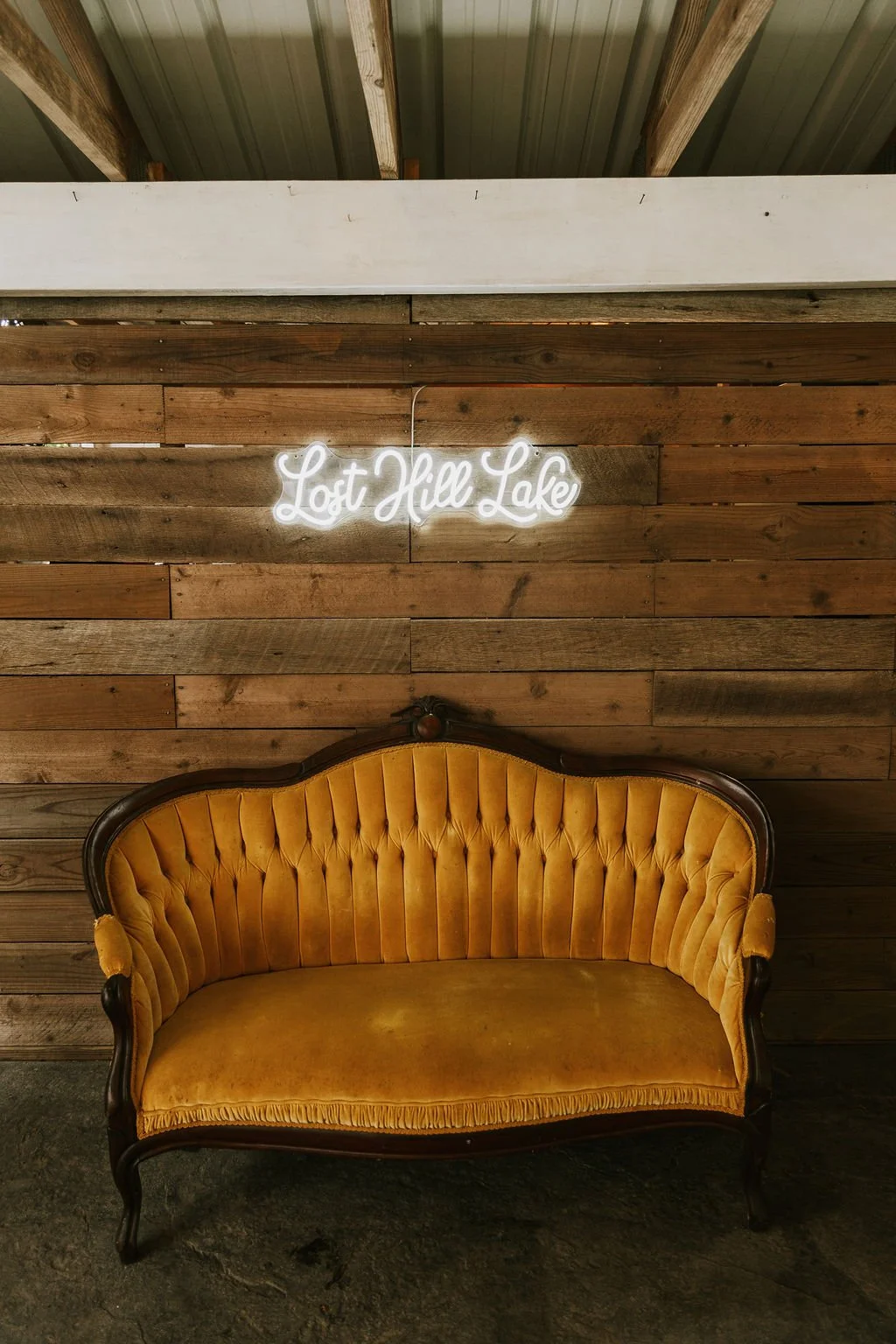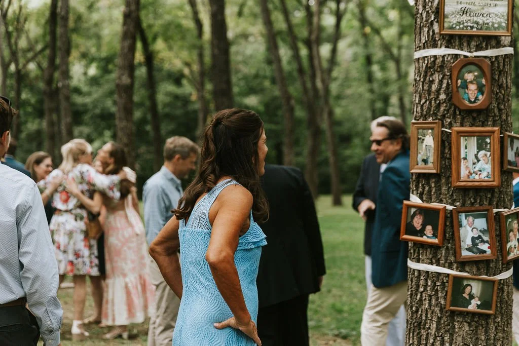 From custom table details featuring photos of the couple through the years to a cozy sweetheart table set against a green couch backdrop, the reception space felt inviting and uniquely theirs. Guests dined, danced, and celebrated late into the evening, surrounded by the natural beauty of Lost Hill Lake.