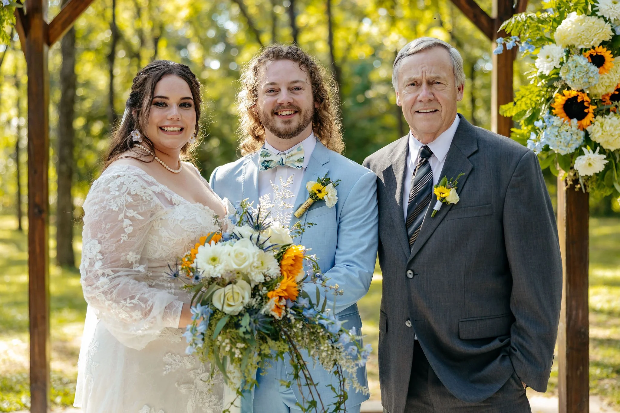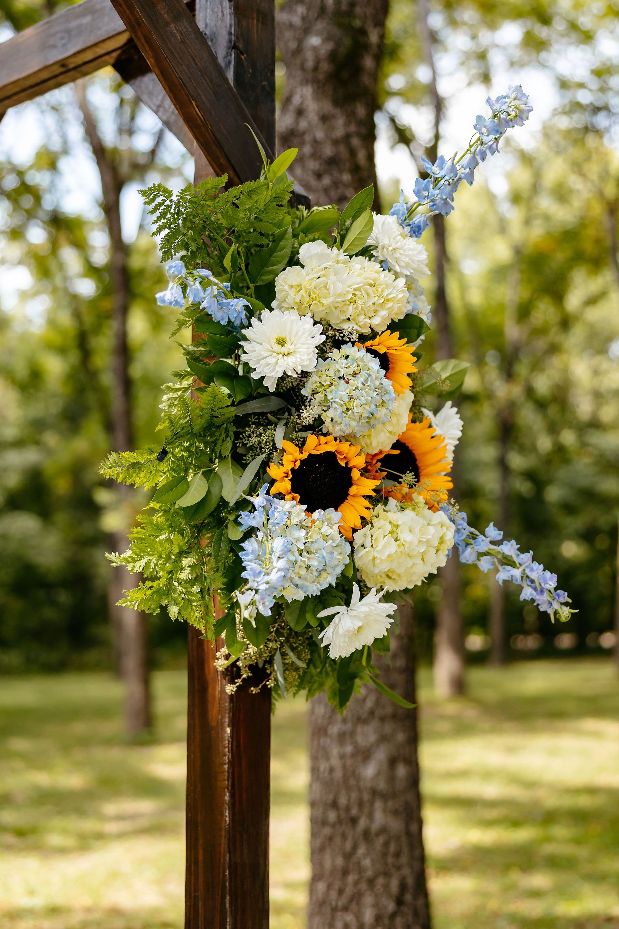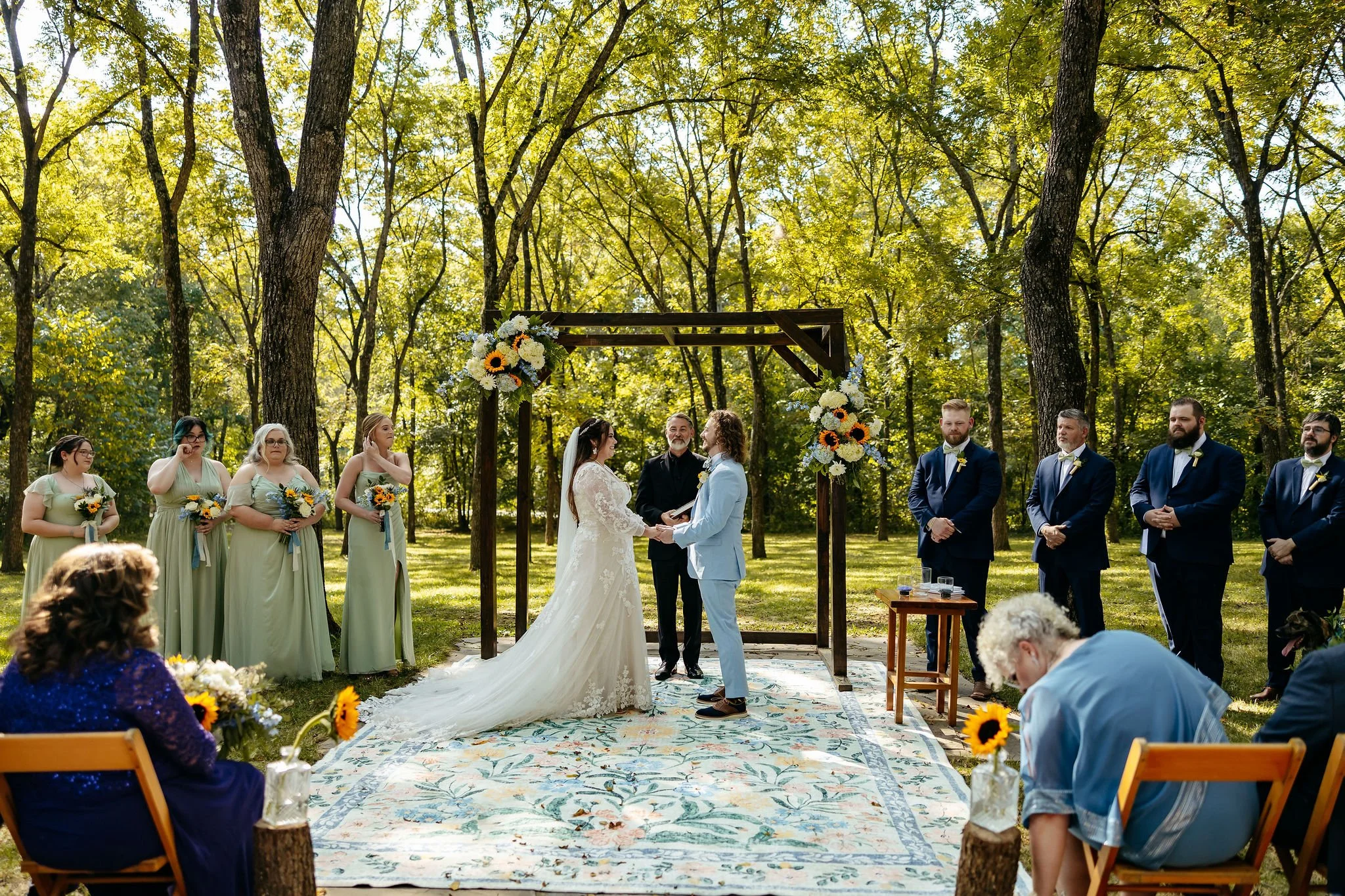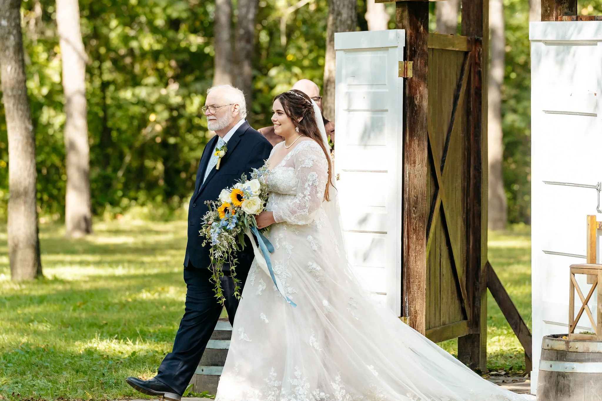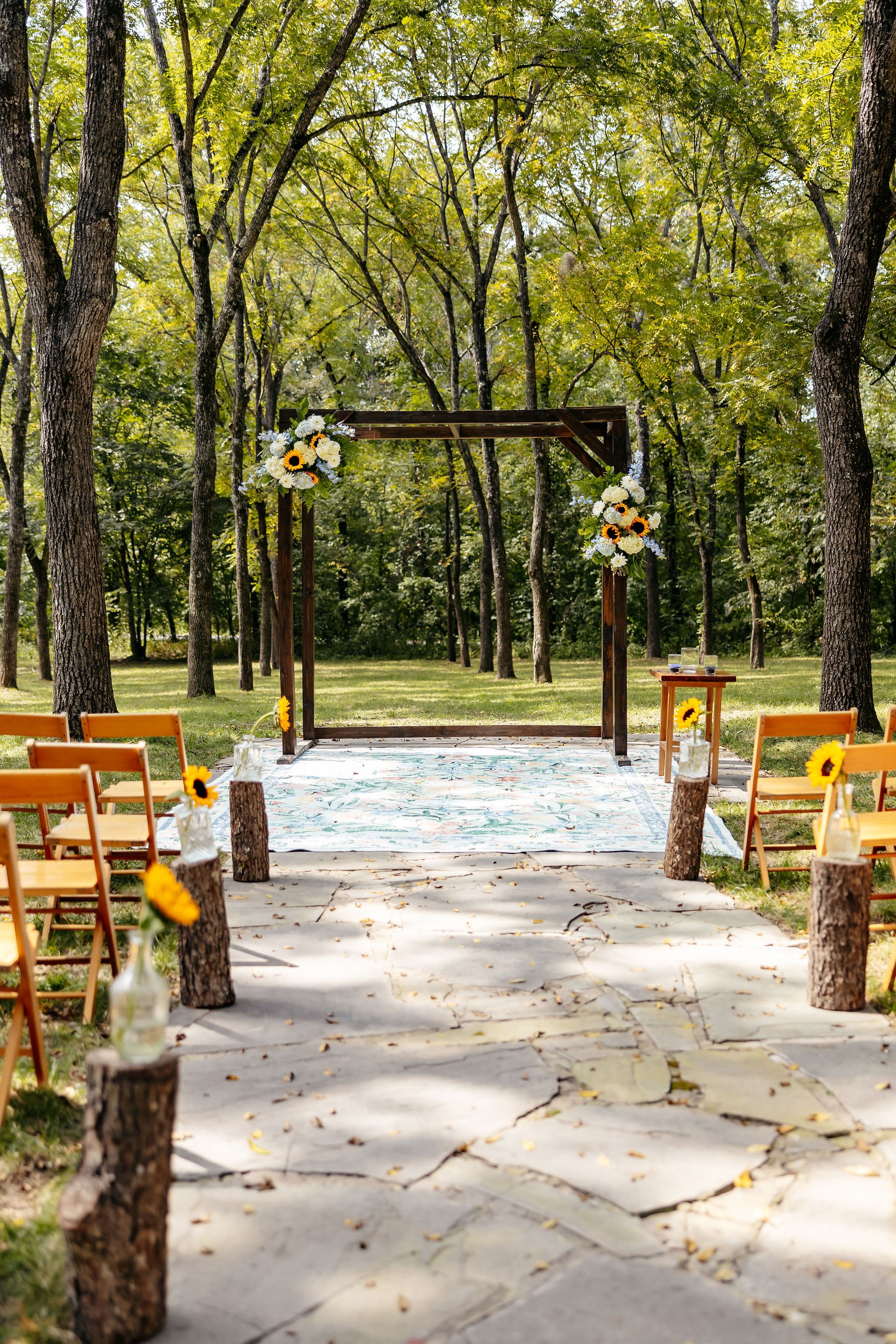 The aisle was lined with wood stumps topped with chunky vintage vases filled with sunflowers, creating a rustic and cheerful pathway to the altar. At the front stood a traditional ceremony arbor accented with florals by Cultivated Blooms, adding a soft romantic touch to the woodland setting.