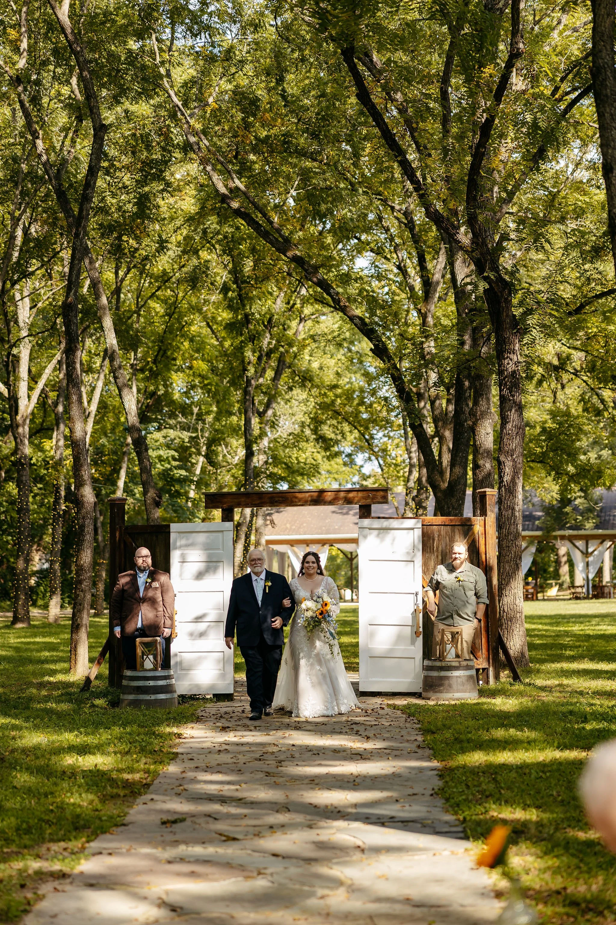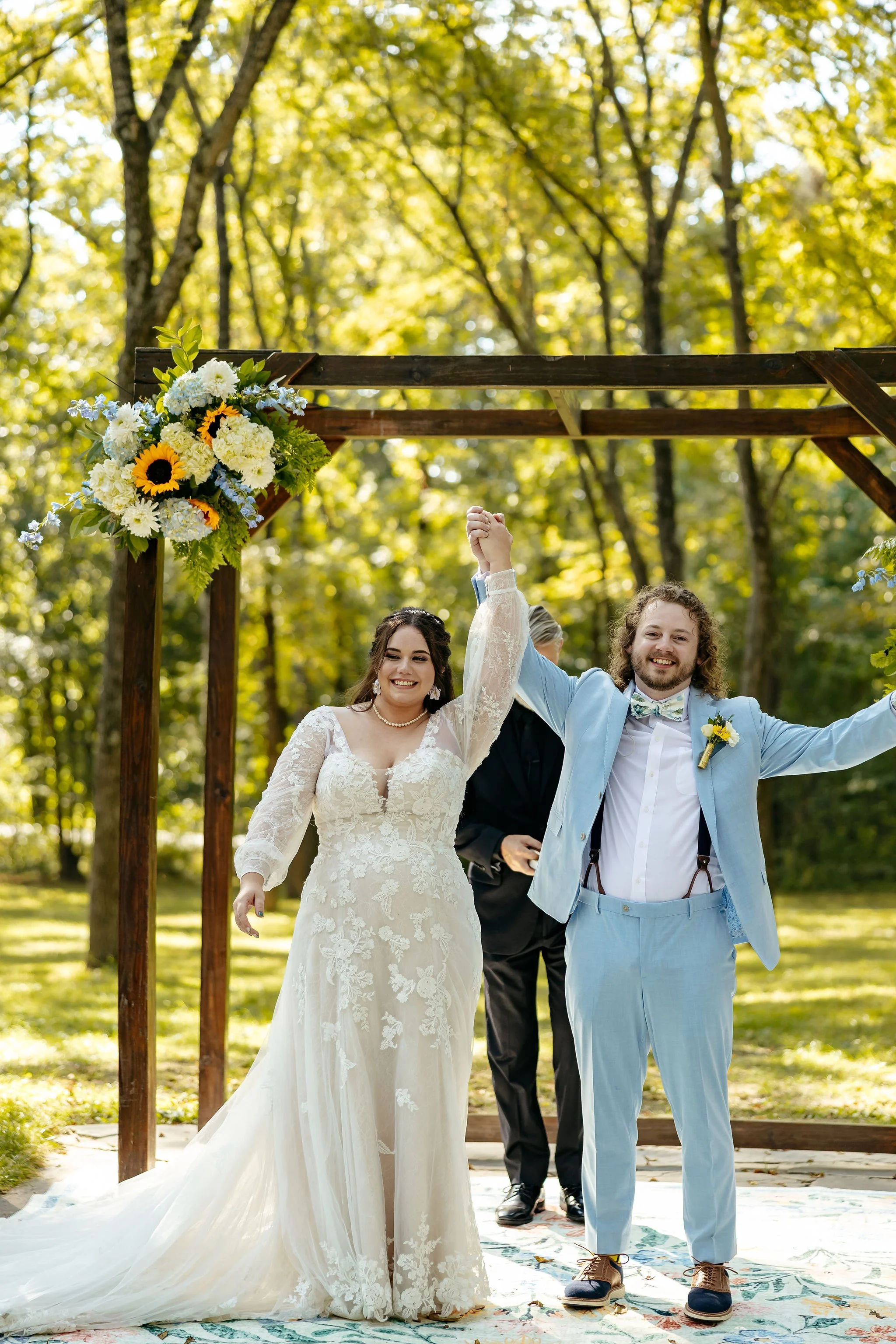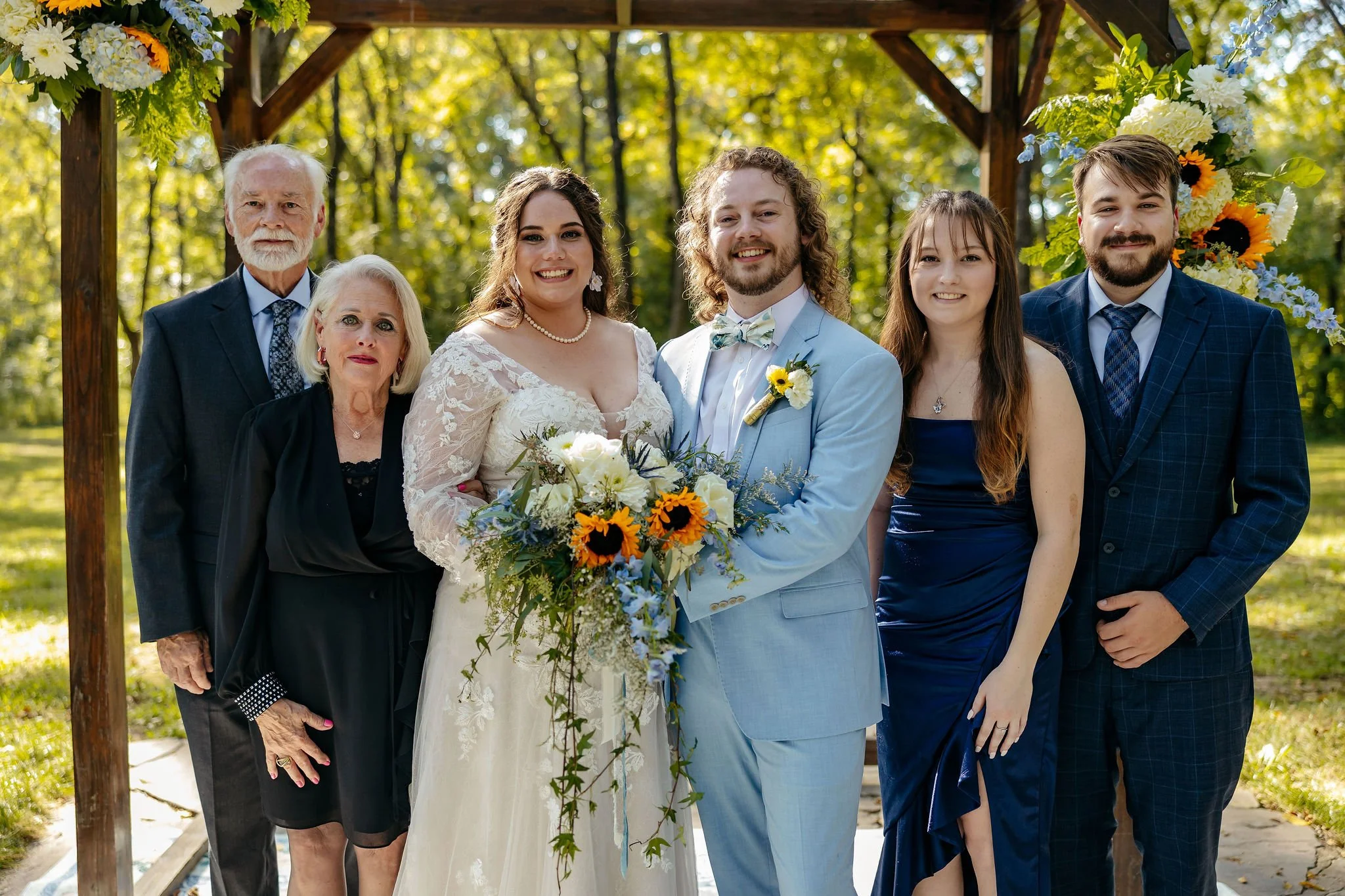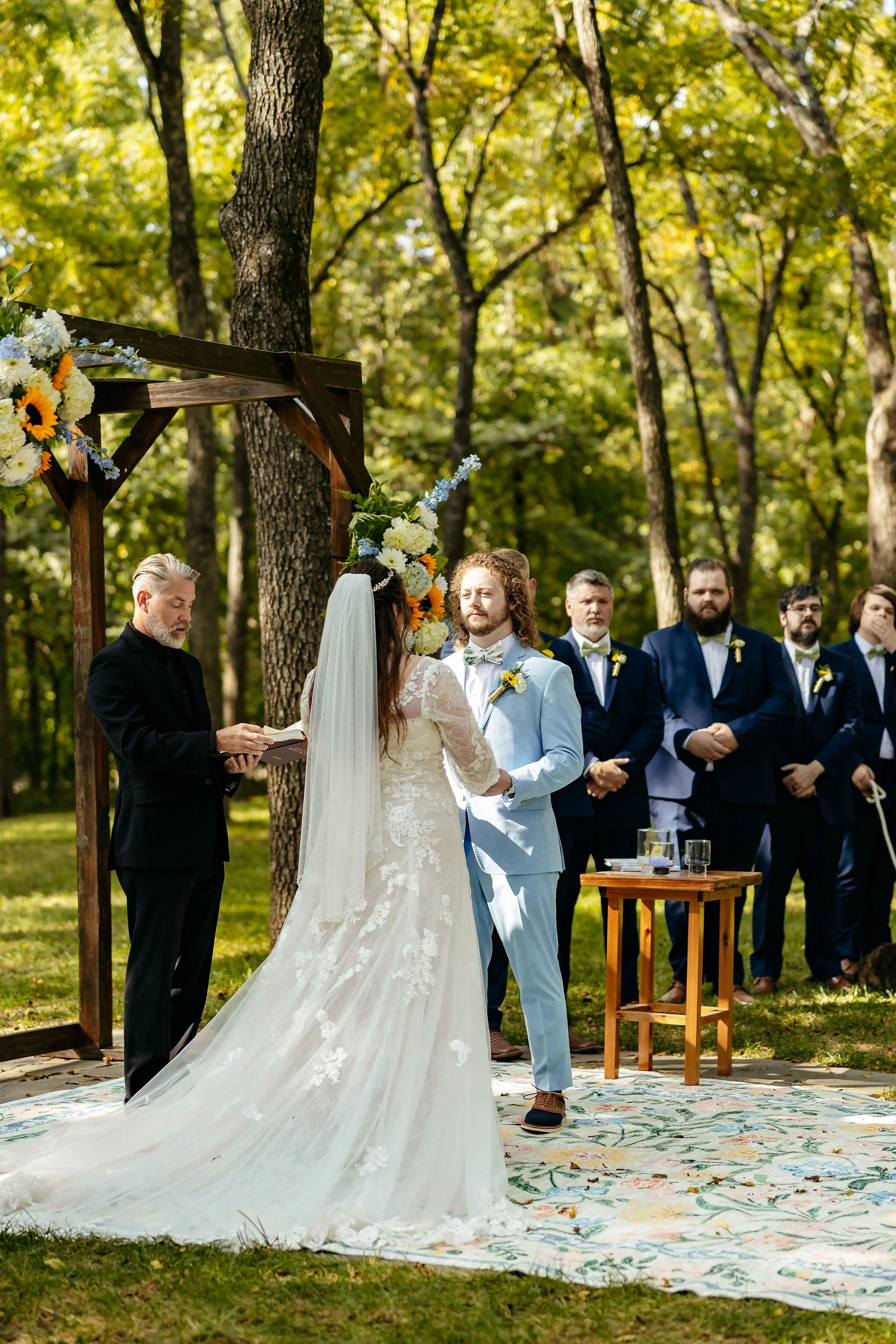 The aisle was lined with wood stumps topped with chunky vintage vases filled with sunflowers, creating a rustic and cheerful pathway to the altar. At the front stood a traditional ceremony arbor accented with florals by Cultivated Blooms, adding a soft romantic touch to the woodland setting.