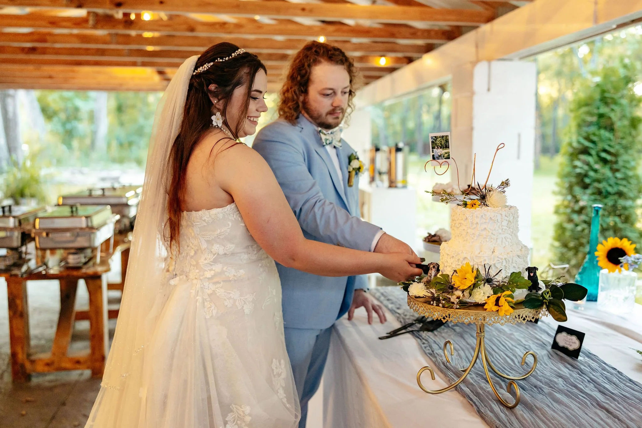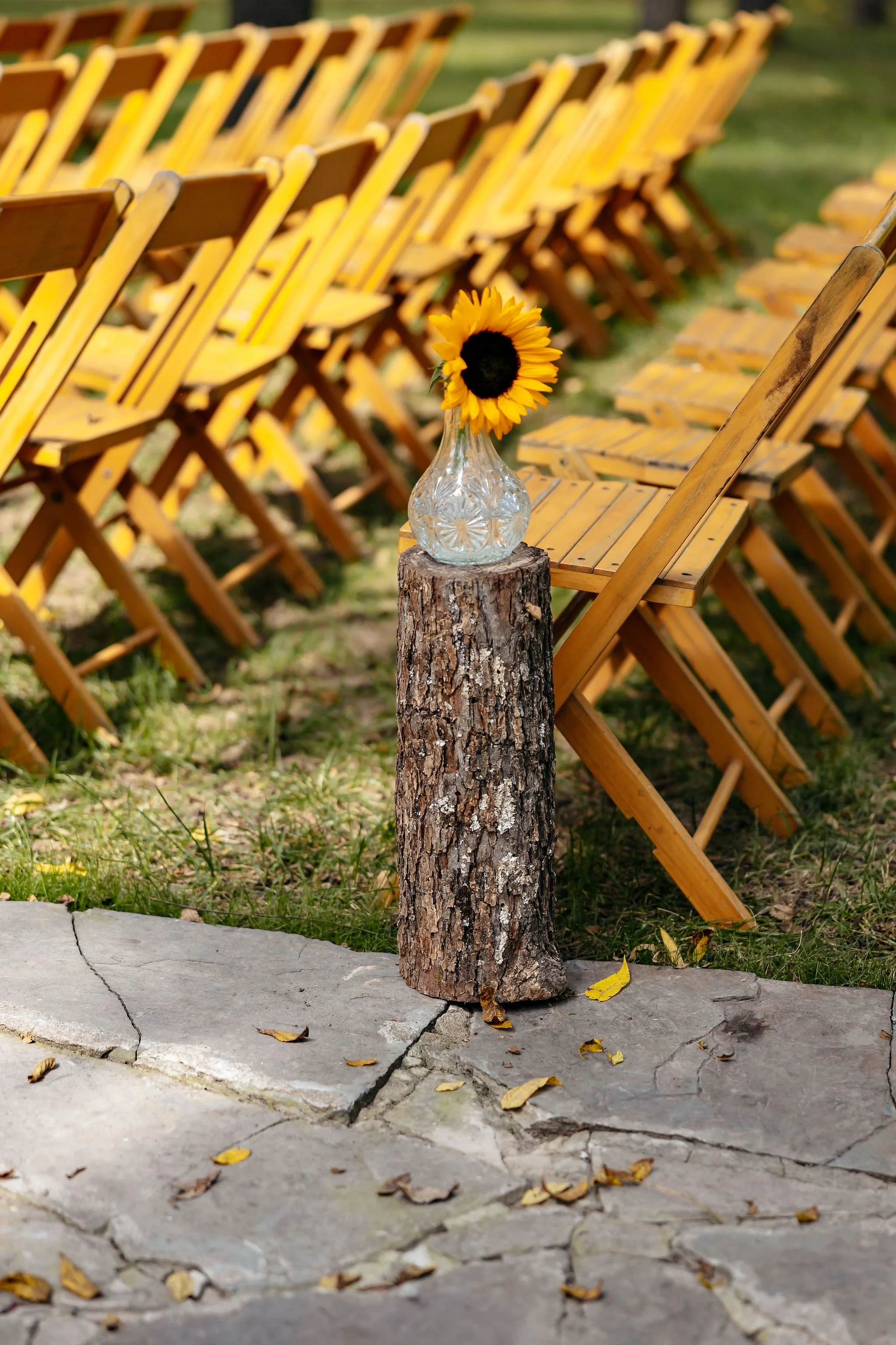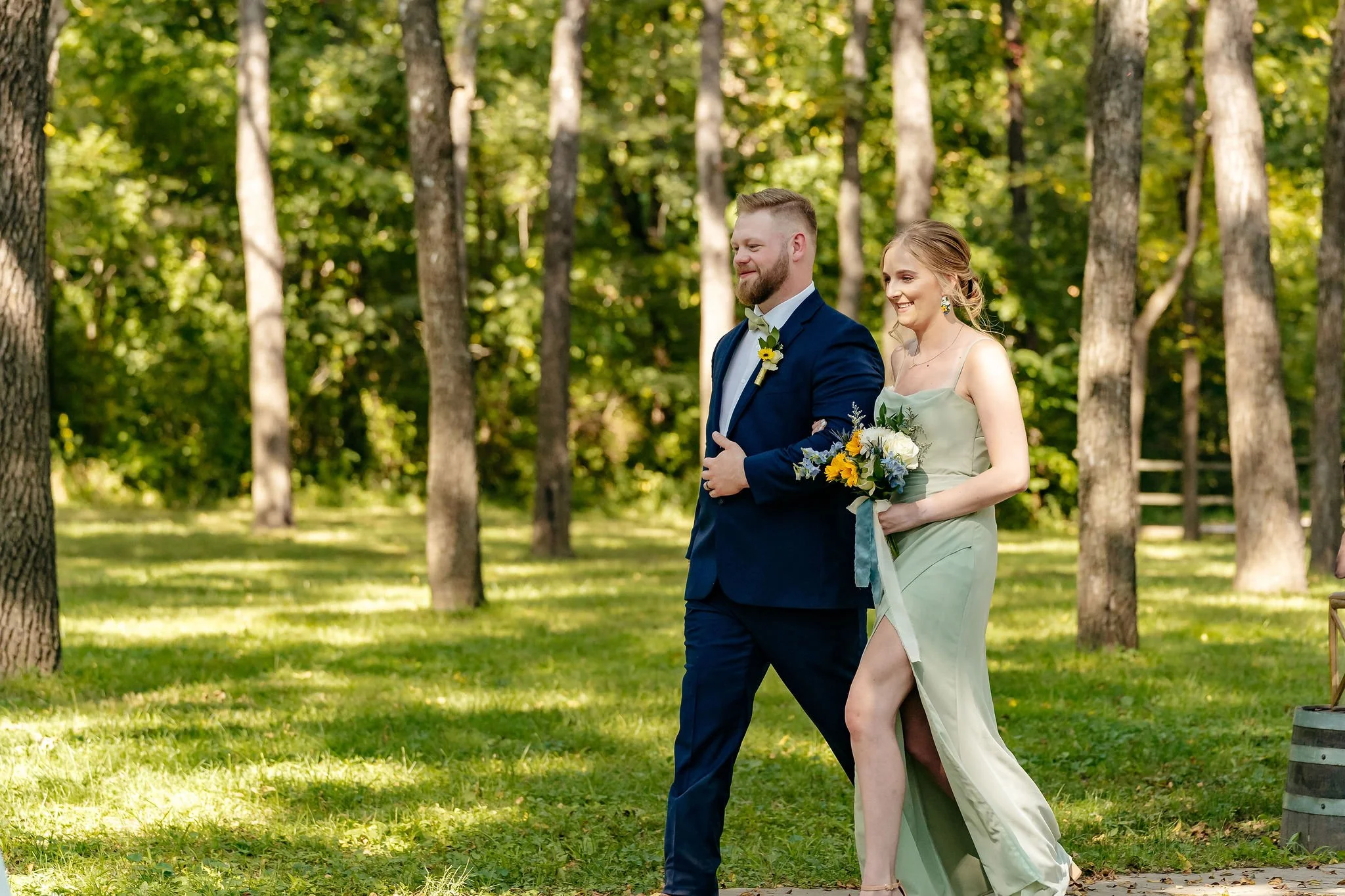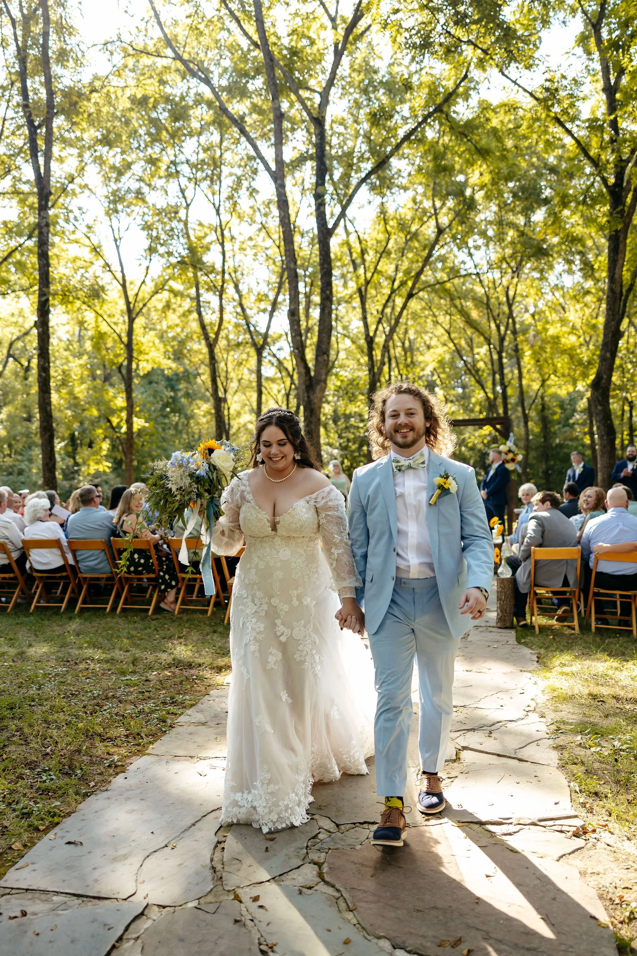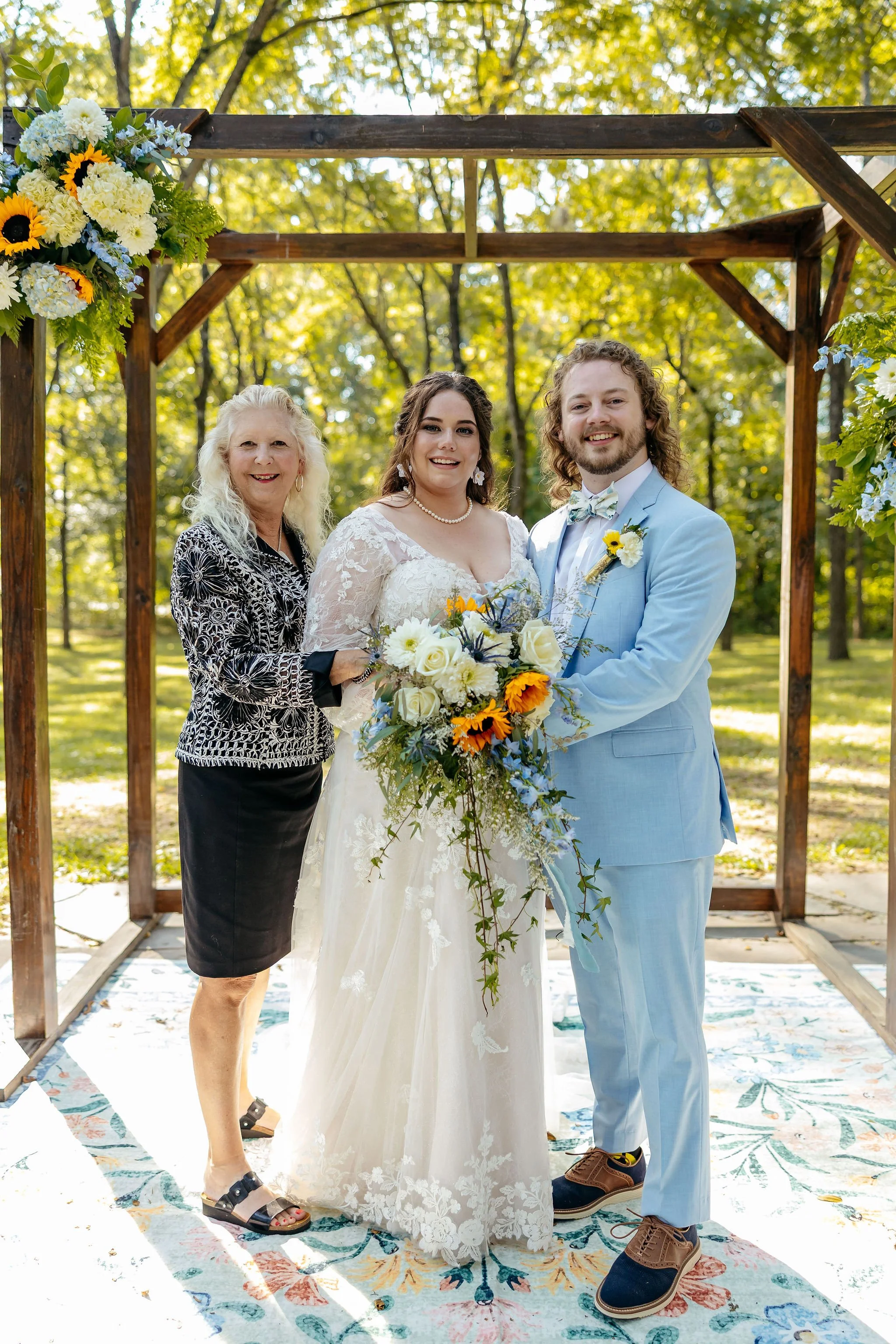 The aisle was lined with wood stumps topped with chunky vintage vases filled with sunflowers, creating a rustic and cheerful pathway to the altar. At the front stood a traditional ceremony arbor accented with florals by Cultivated Blooms, adding a soft romantic touch to the woodland setting.