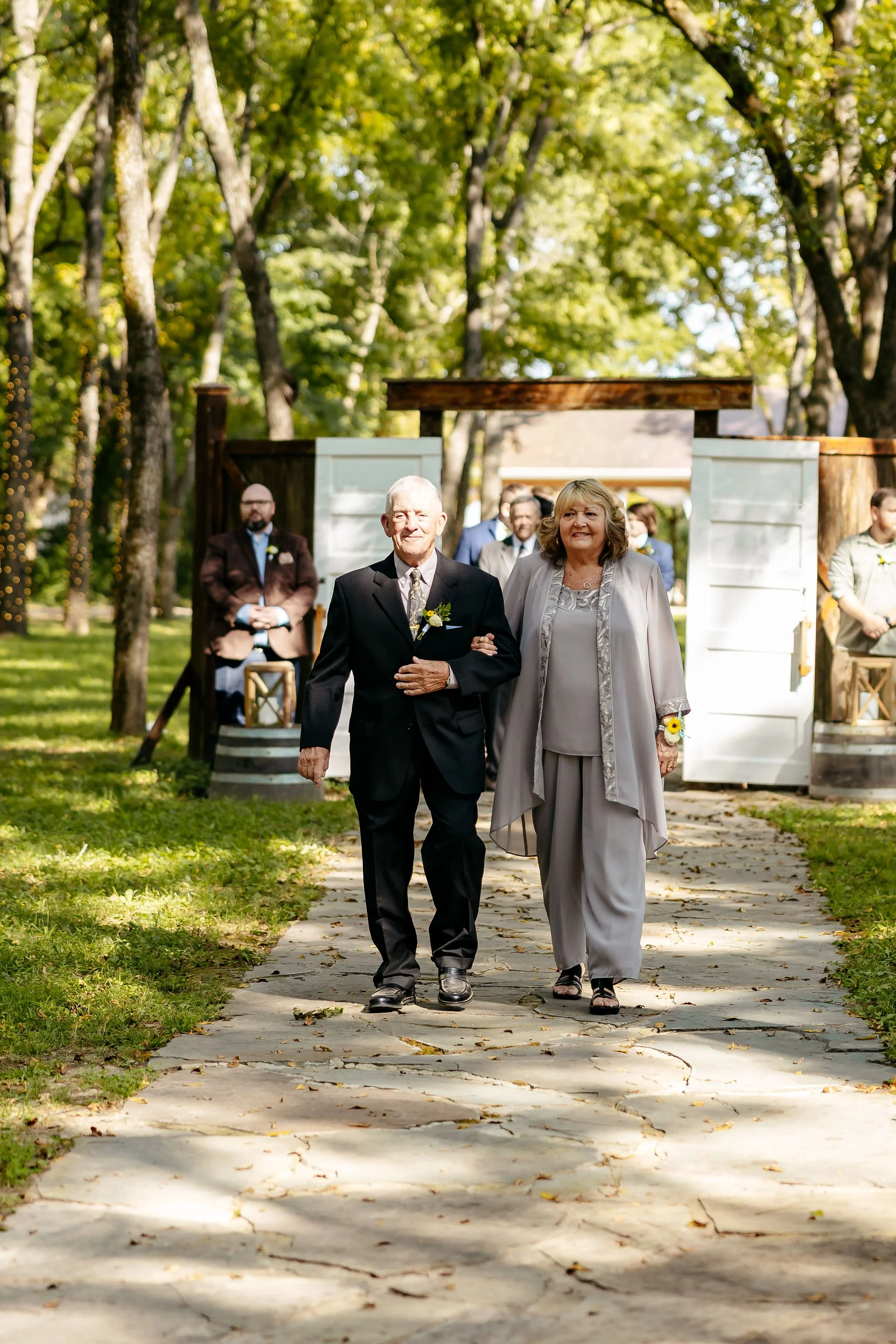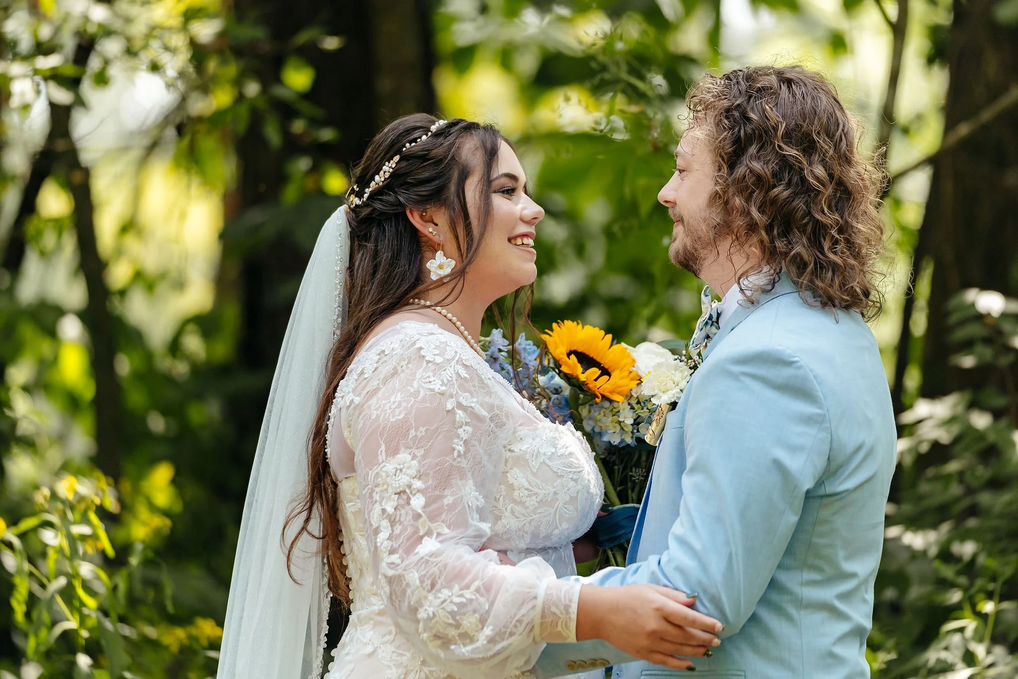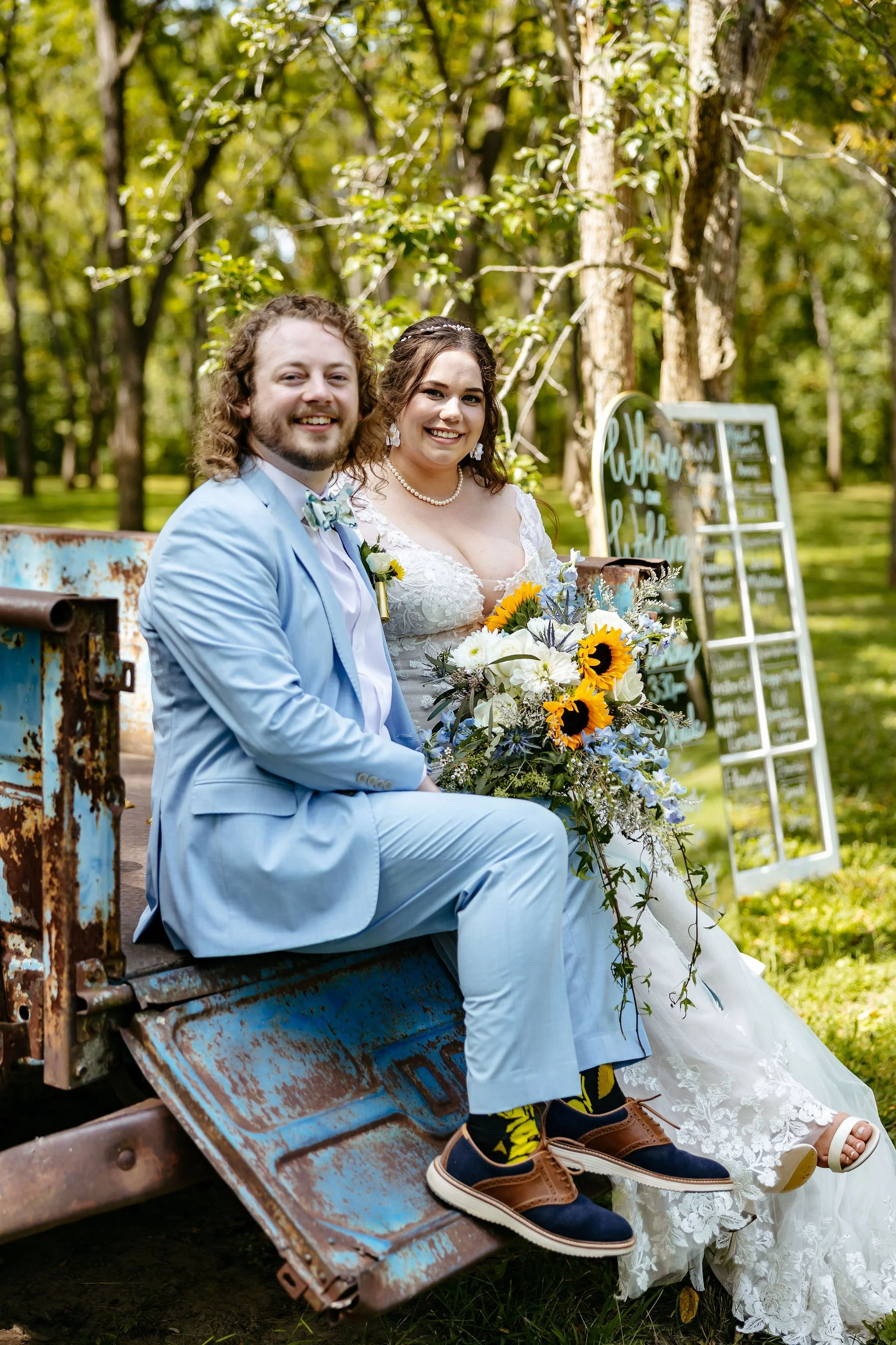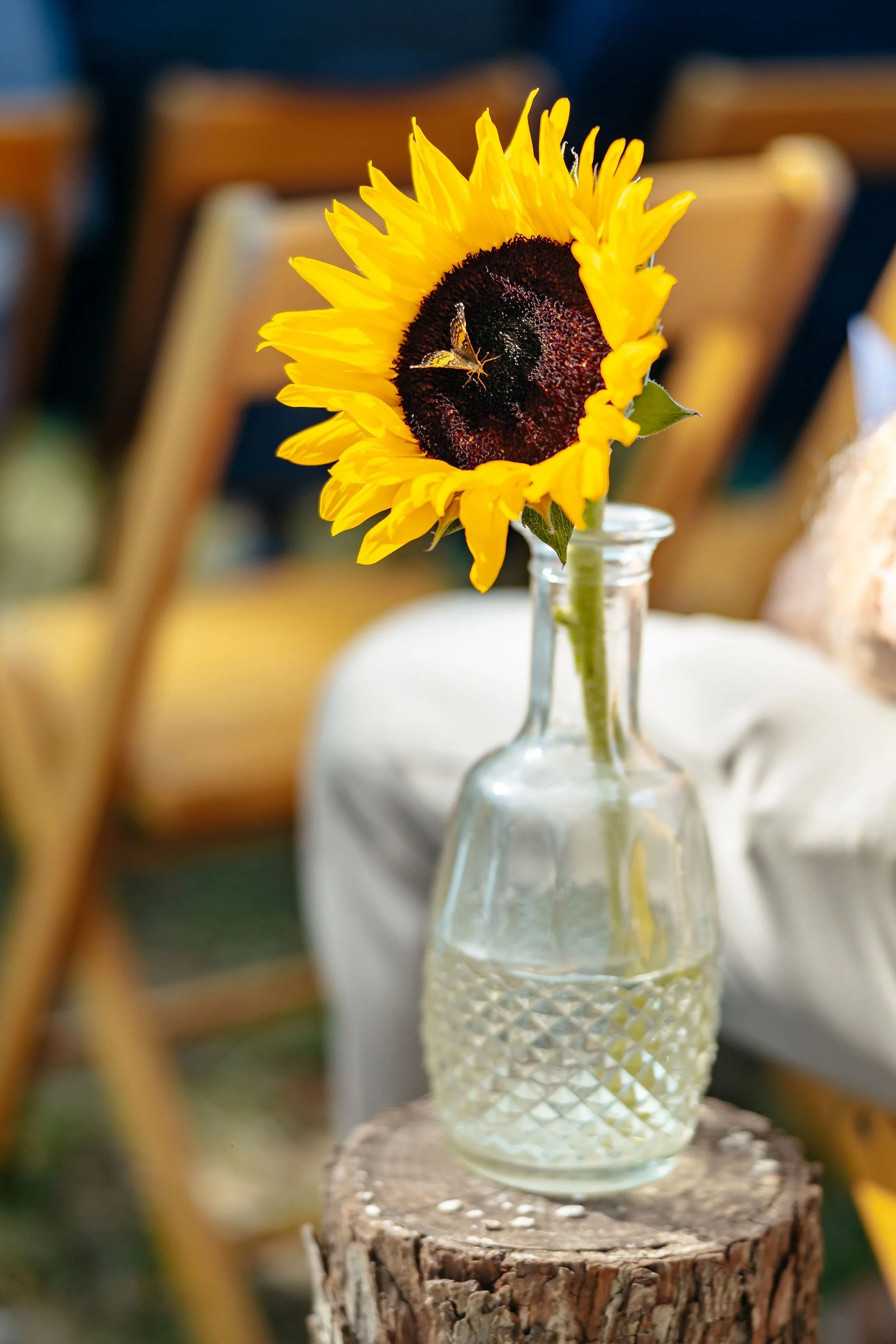 The aisle was lined with wood stumps topped with chunky vintage vases filled with sunflowers, creating a rustic and cheerful pathway to the altar. At the front stood a traditional ceremony arbor accented with florals by Cultivated Blooms, adding a soft romantic touch to the woodland setting.