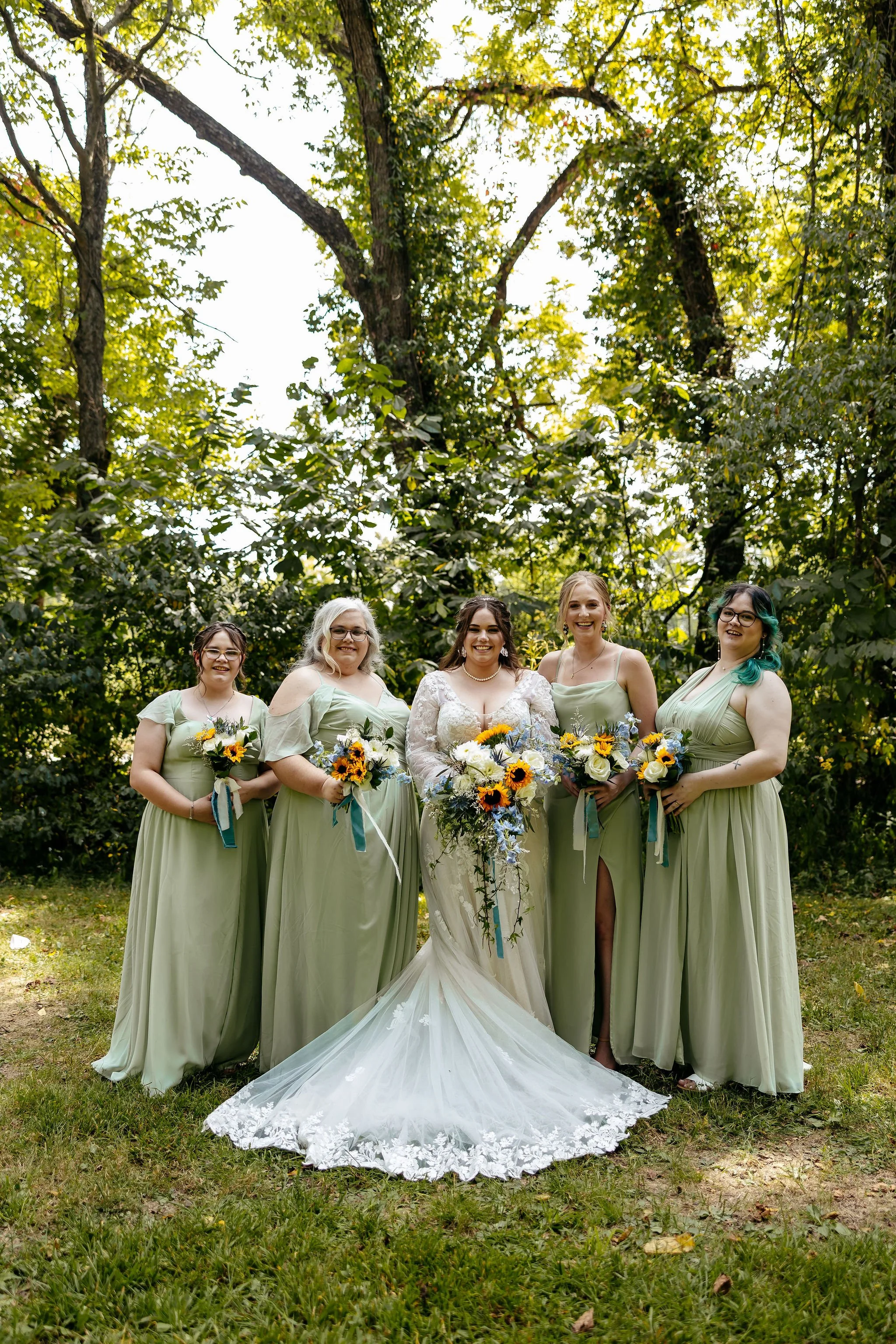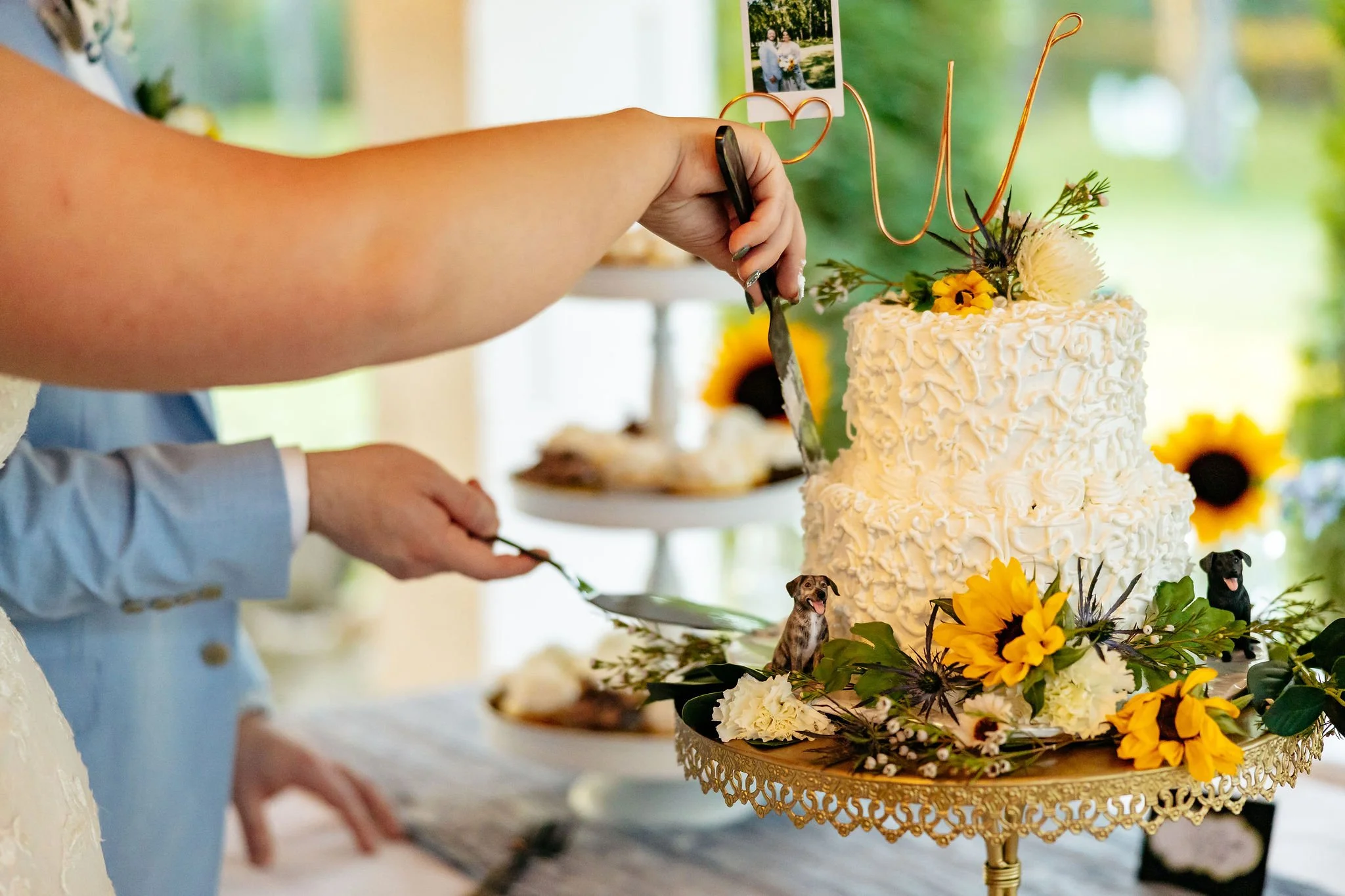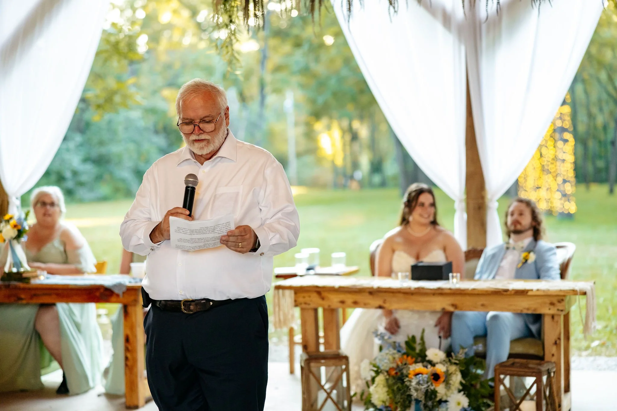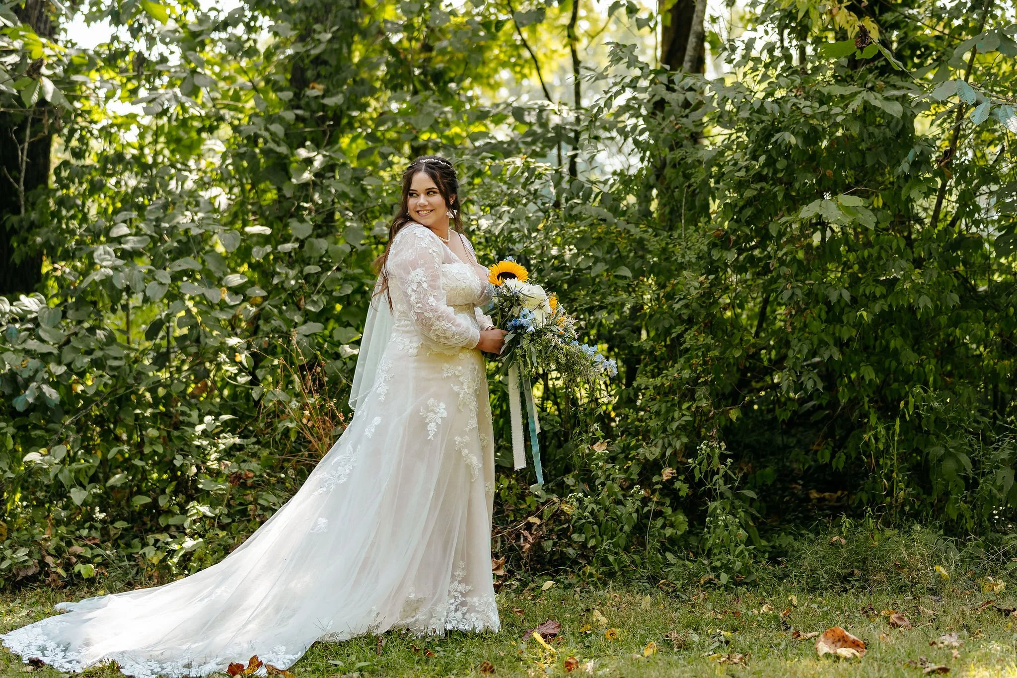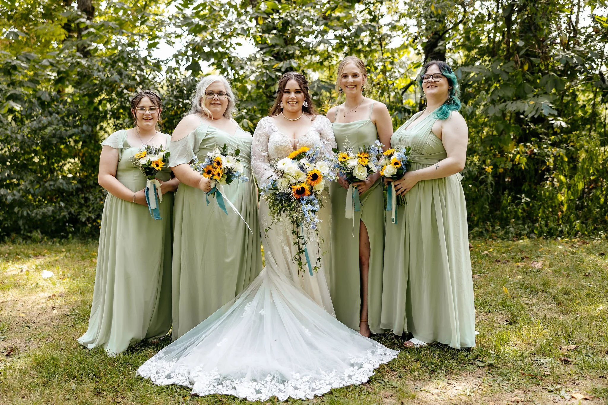The aisle was lined with wood stumps topped with chunky vintage vases filled with sunflowers, creating a rustic and cheerful pathway to the altar. At the front stood a traditional ceremony arbor accented with florals by Cultivated Blooms, adding a soft romantic touch to the woodland setting.
