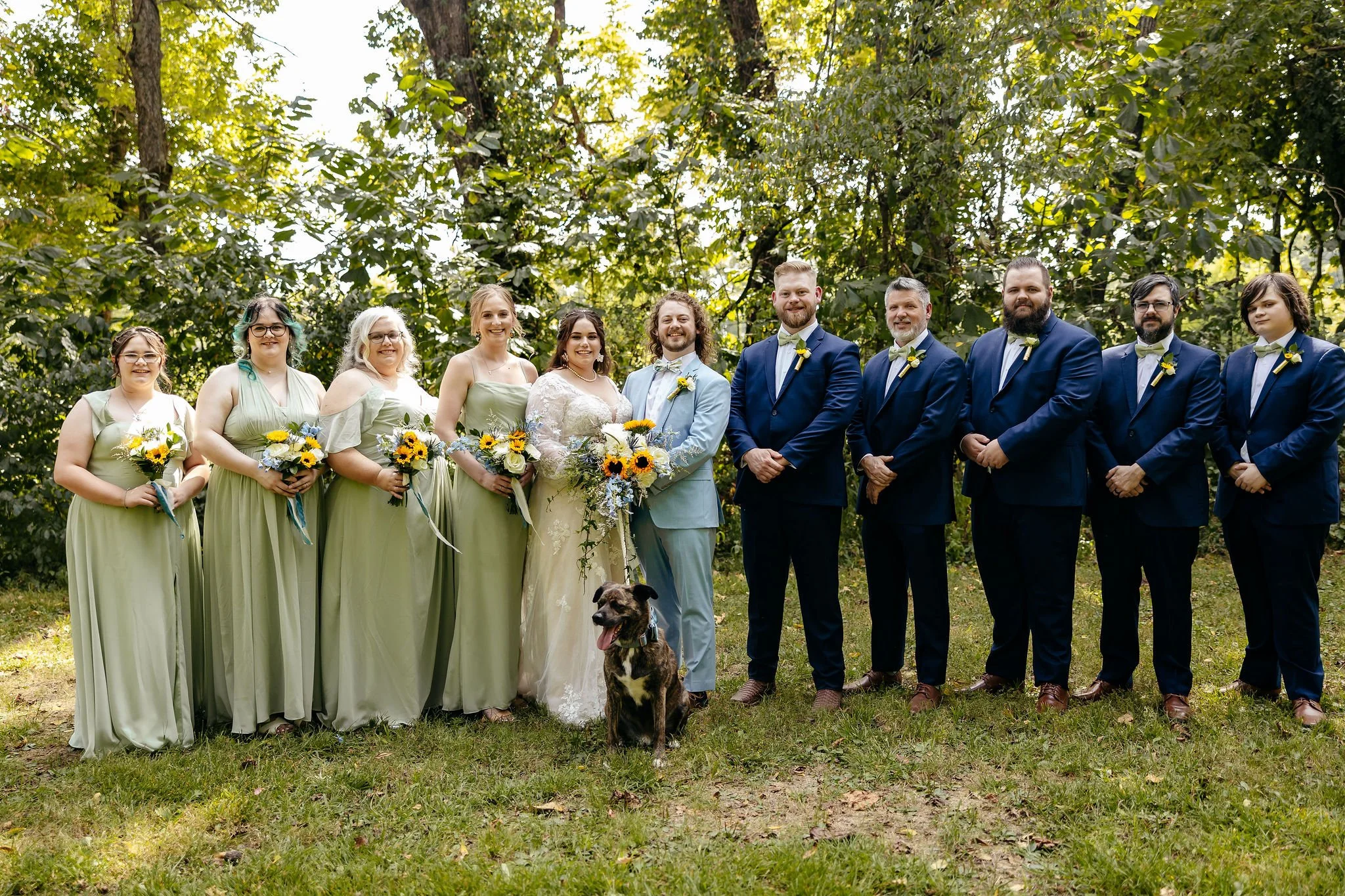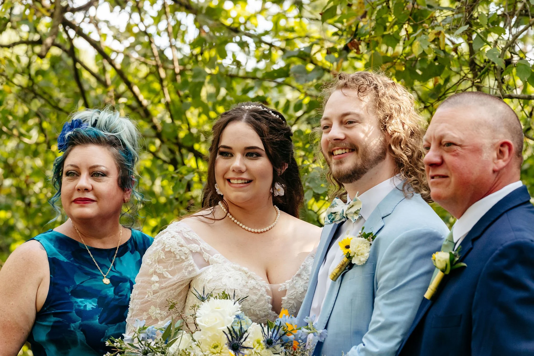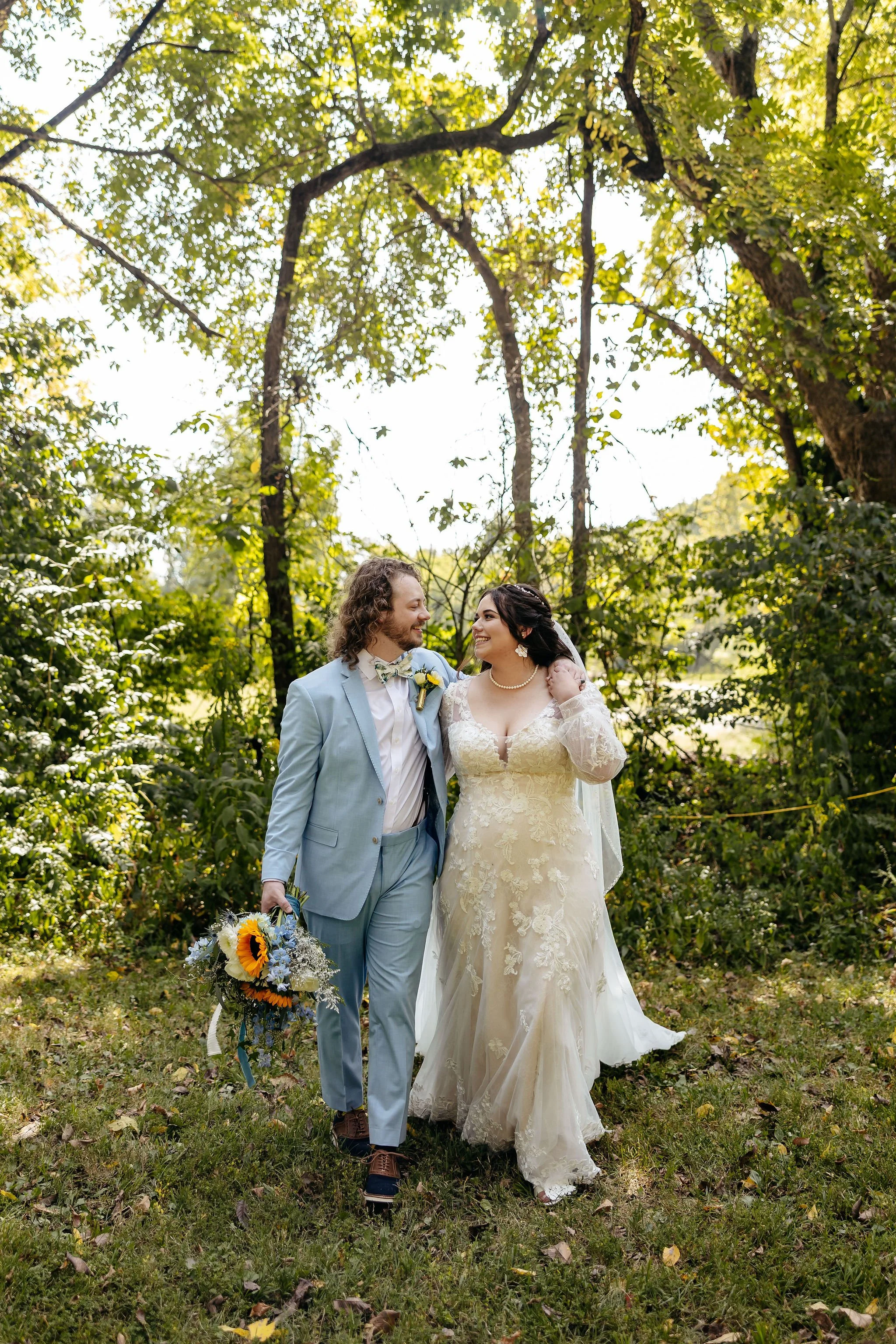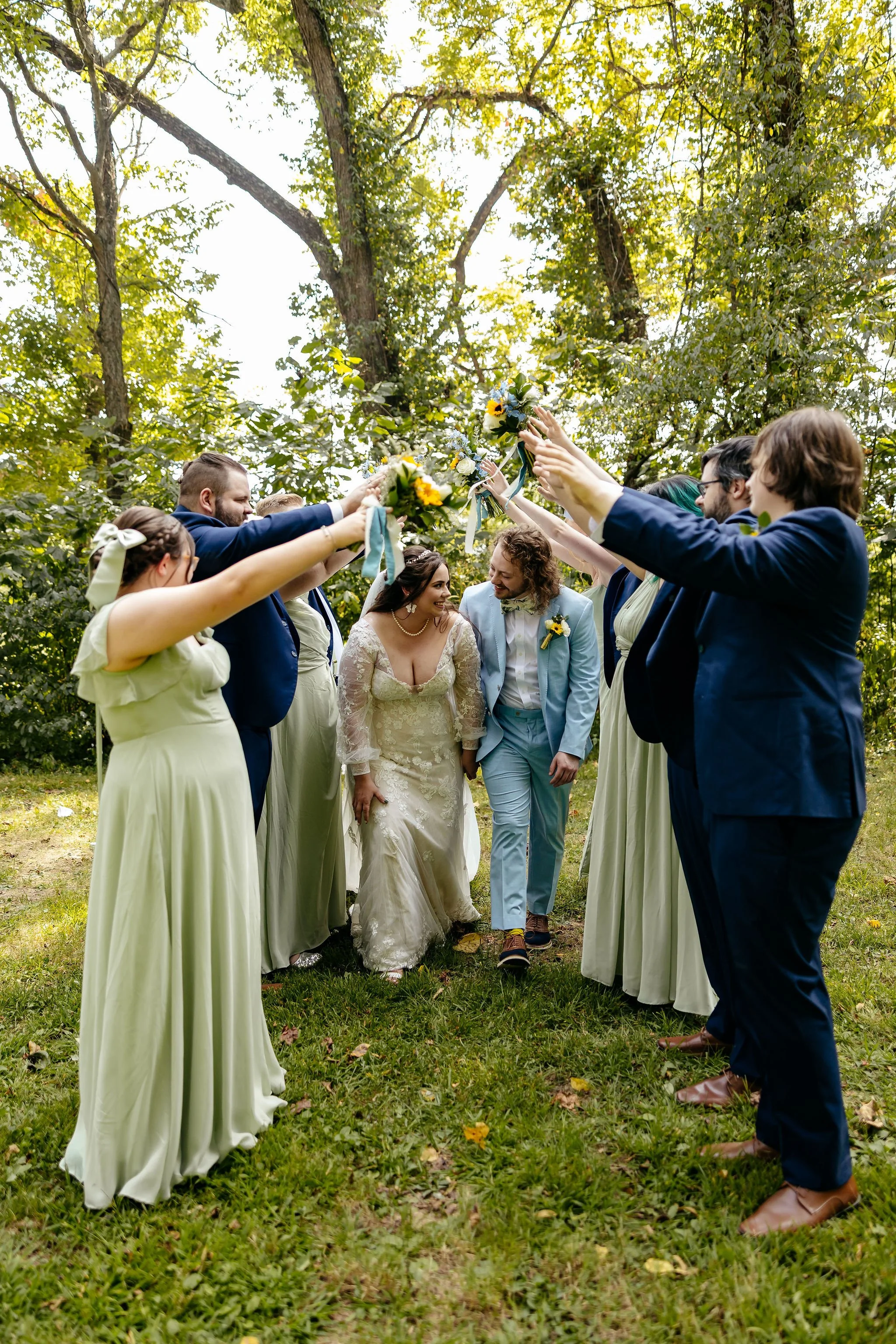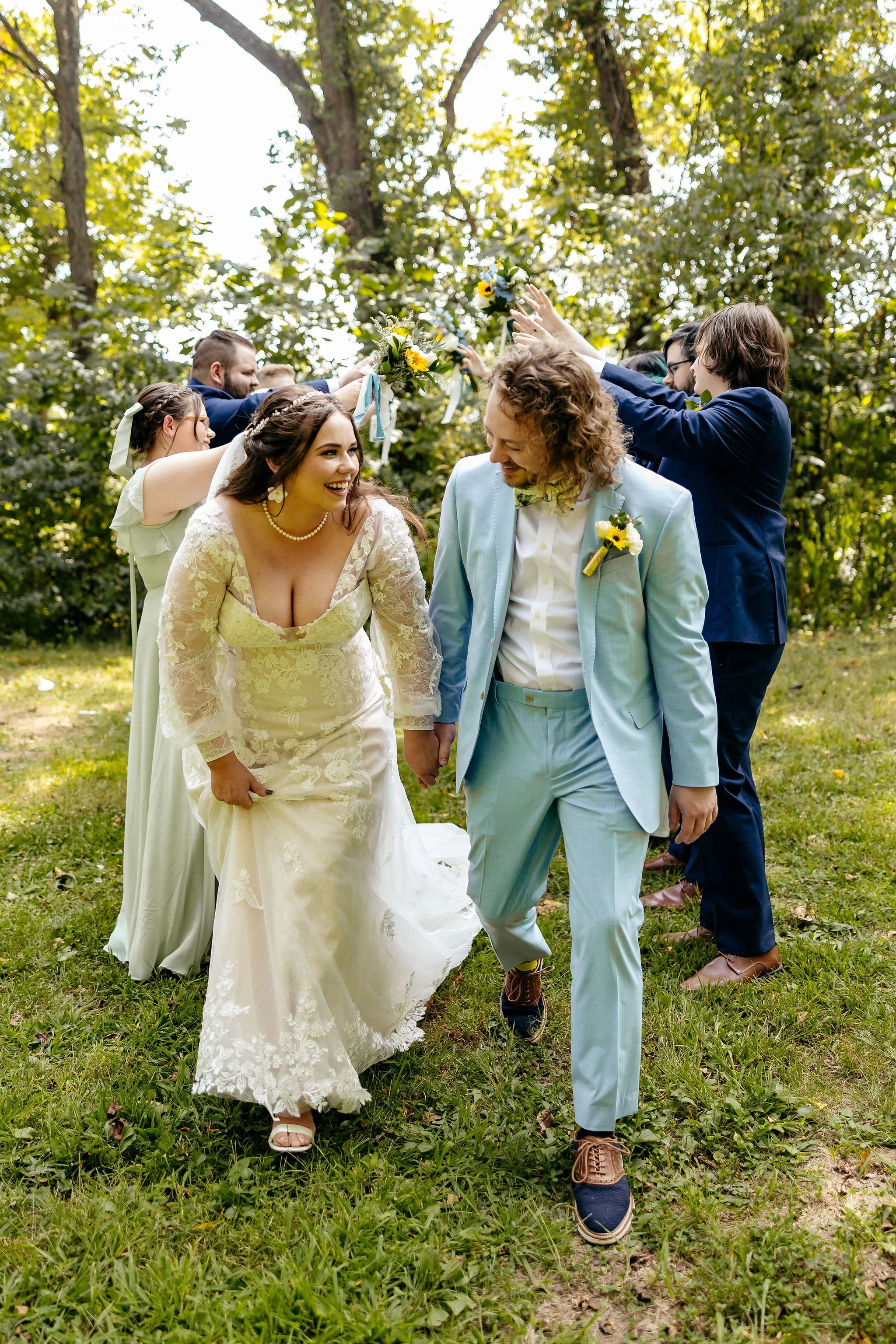 The aisle was lined with wood stumps topped with chunky vintage vases filled with sunflowers, creating a rustic and cheerful pathway to the altar. At the front stood a traditional ceremony arbor accented with florals by Cultivated Blooms, adding a soft romantic touch to the woodland setting.