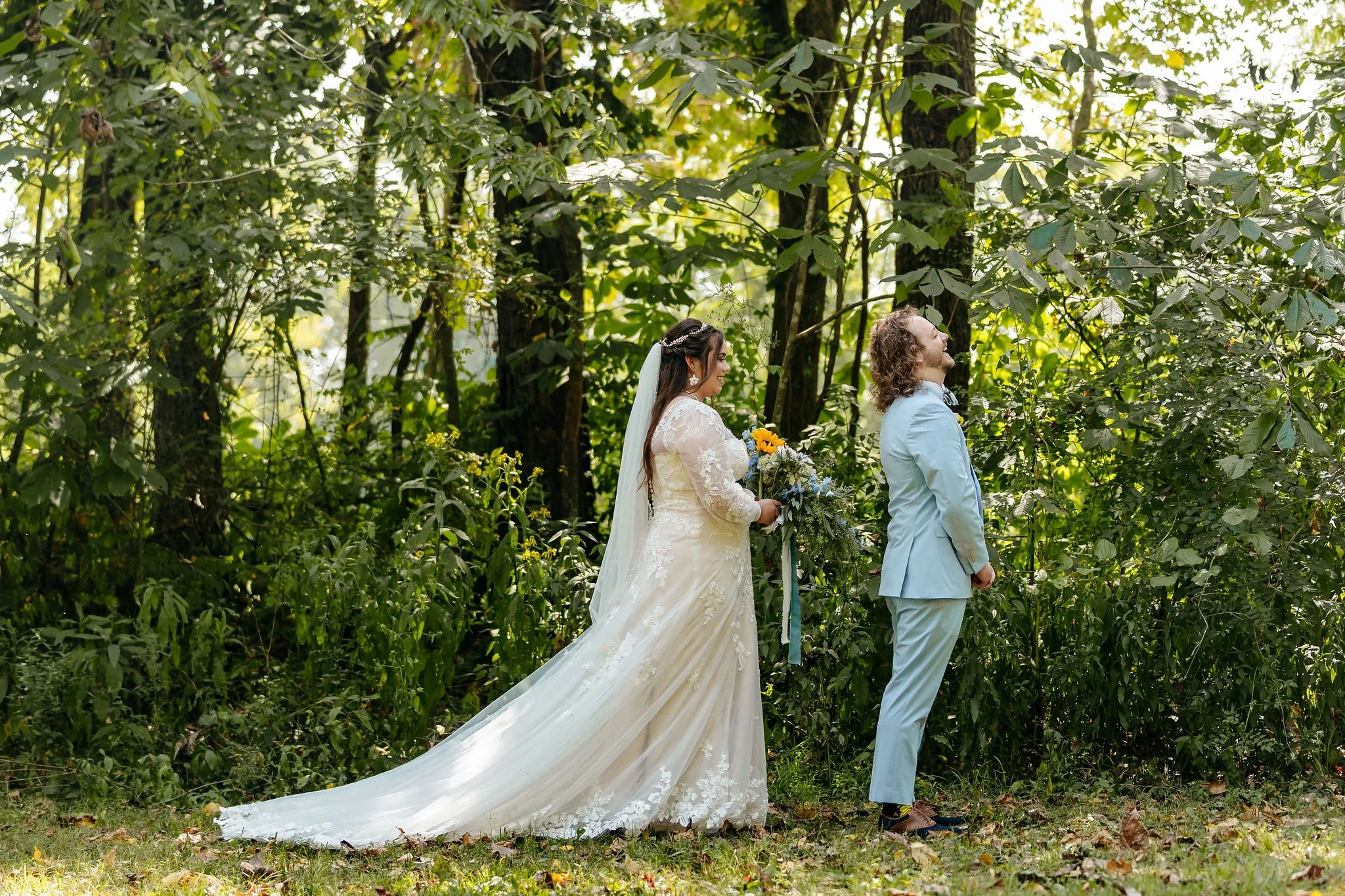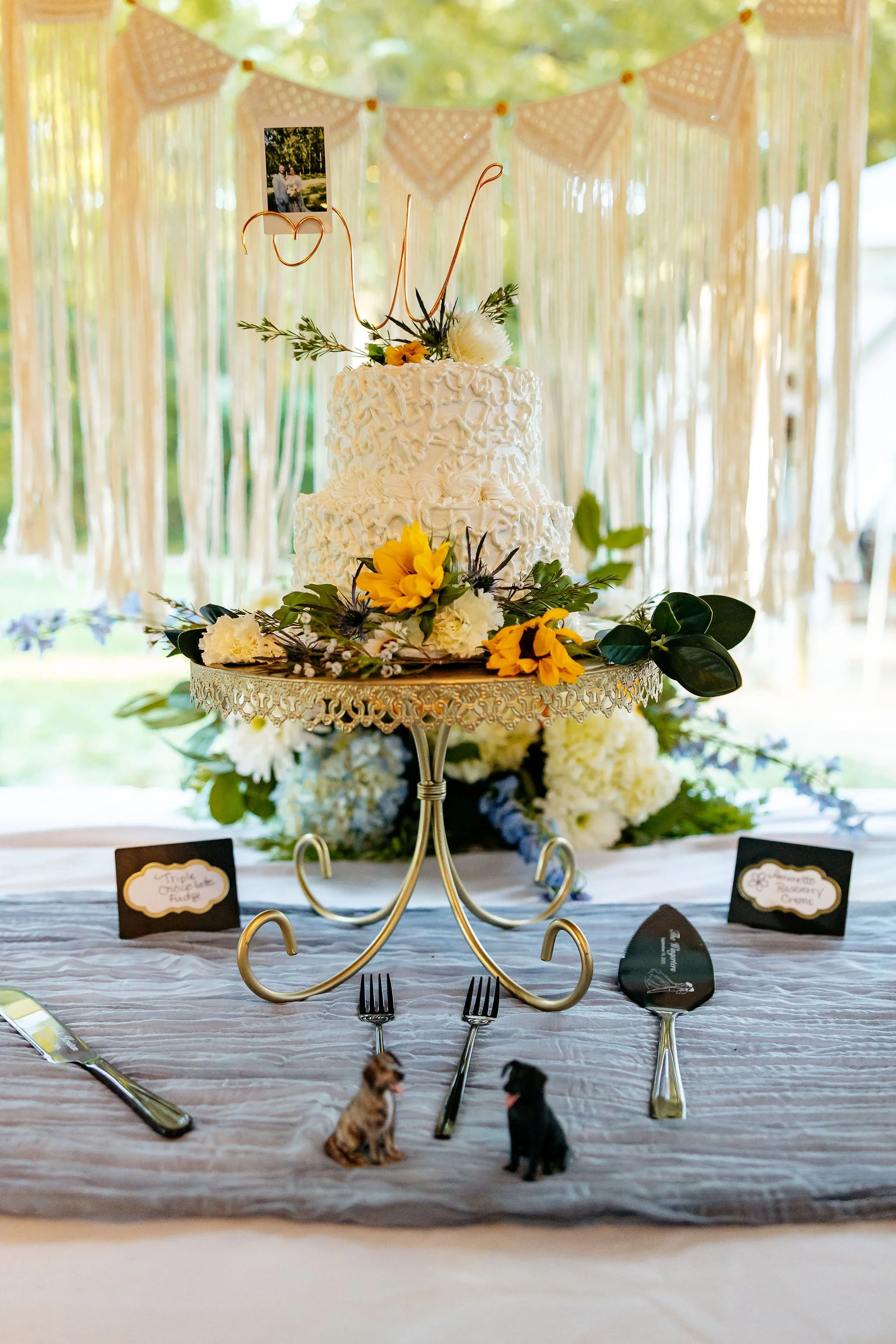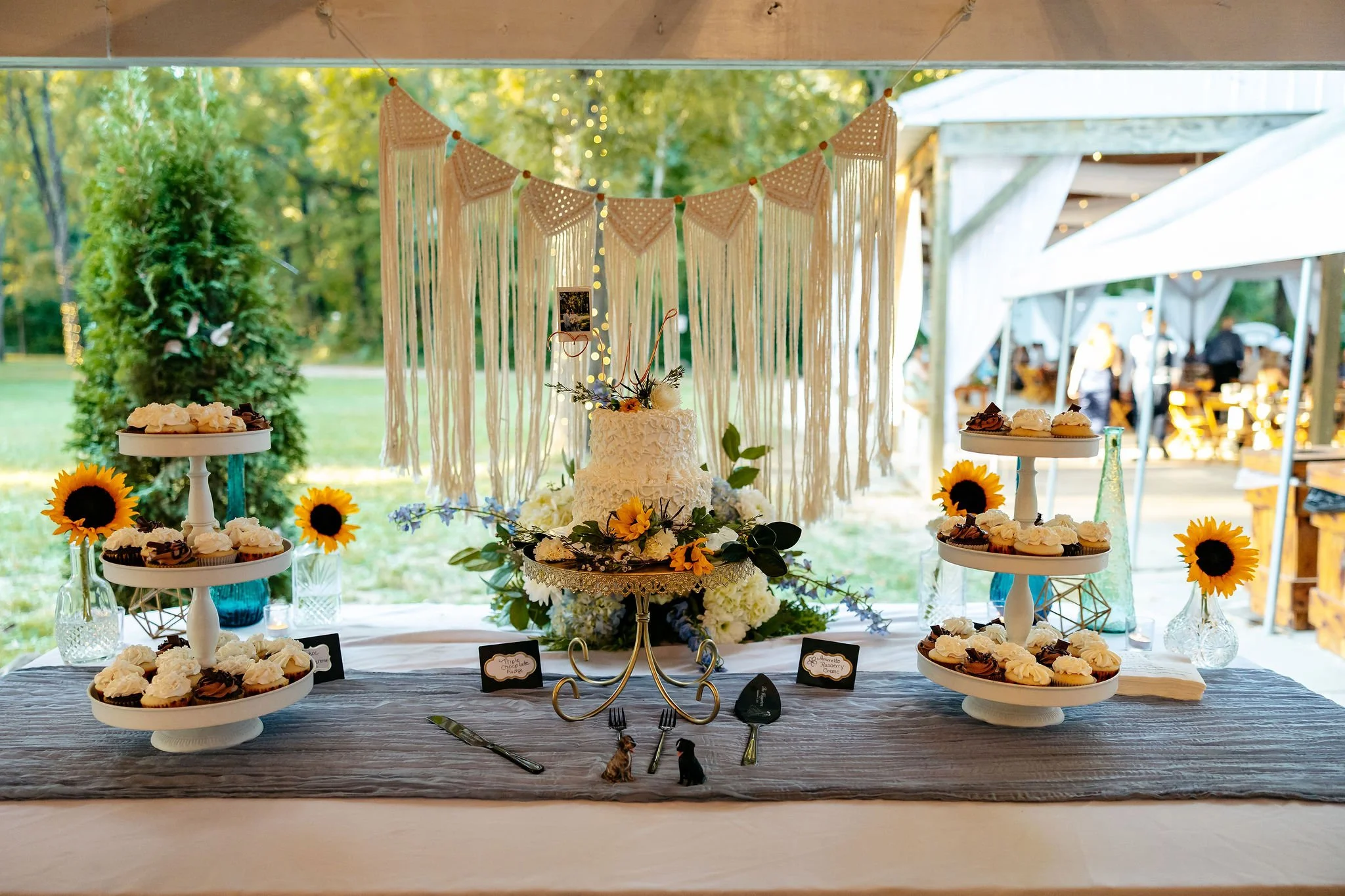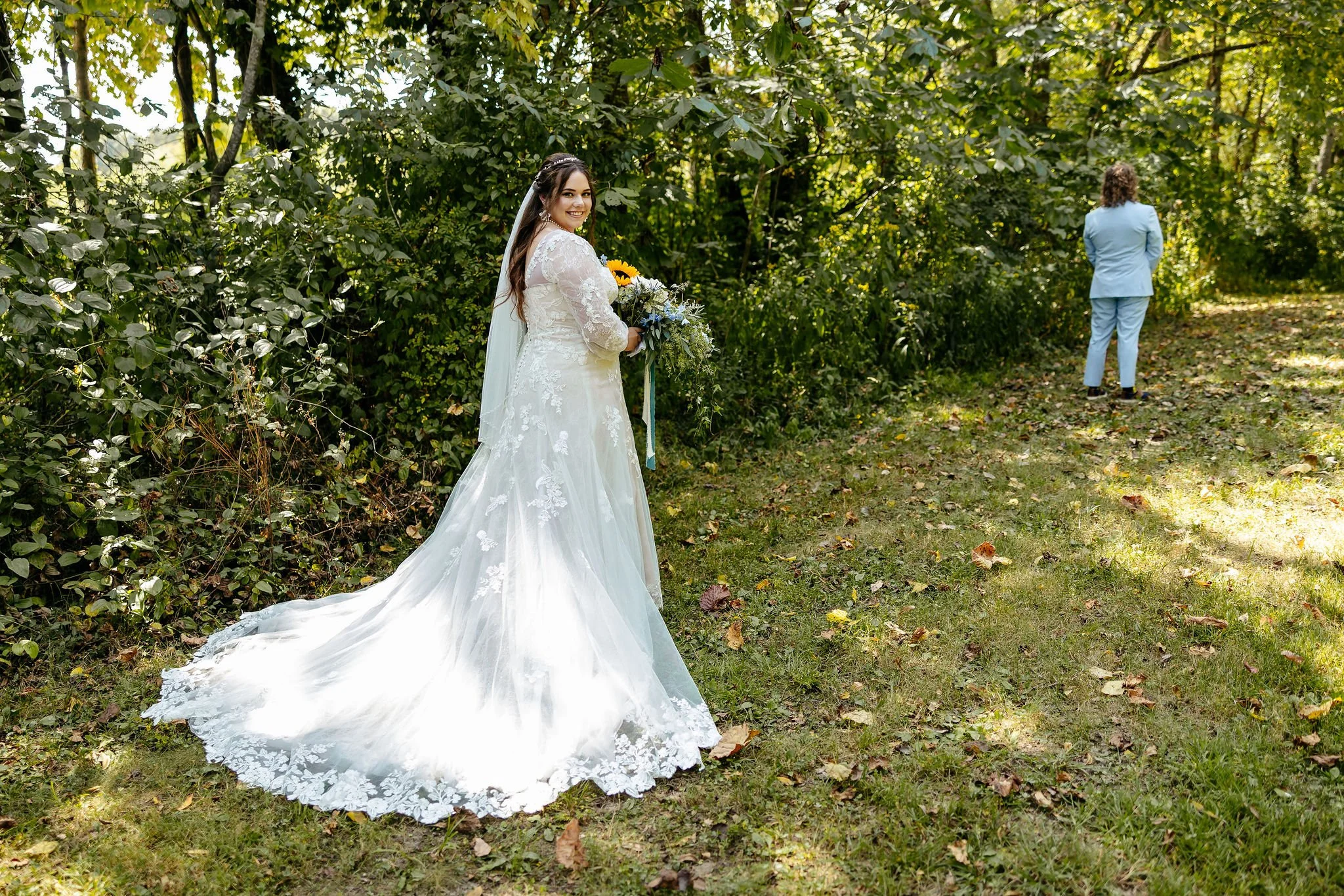 The aisle was lined with wood stumps topped with chunky vintage vases filled with sunflowers, creating a rustic and cheerful pathway to the altar. At the front stood a traditional ceremony arbor accented with florals by Cultivated Blooms, adding a soft romantic touch to the woodland setting.