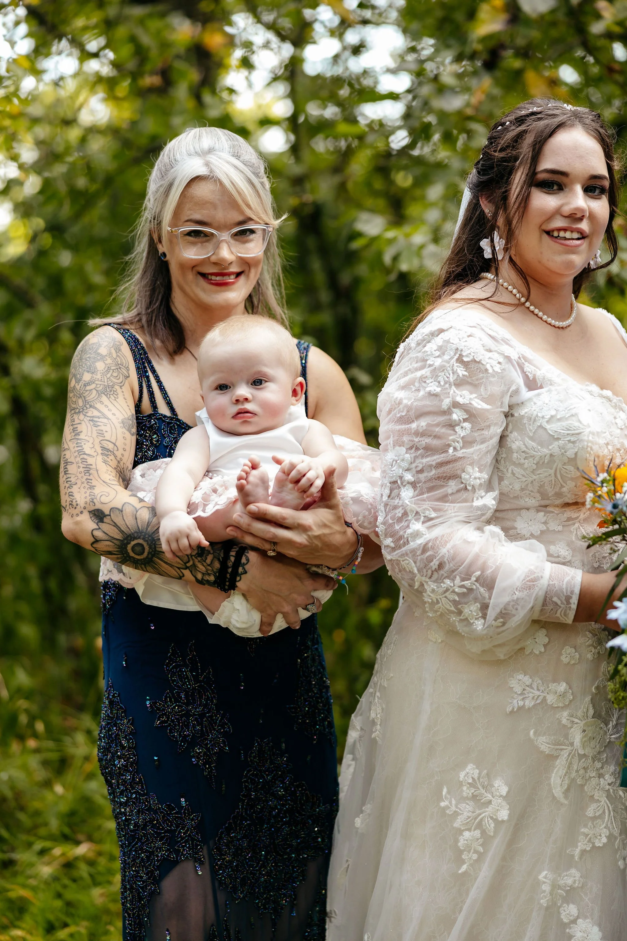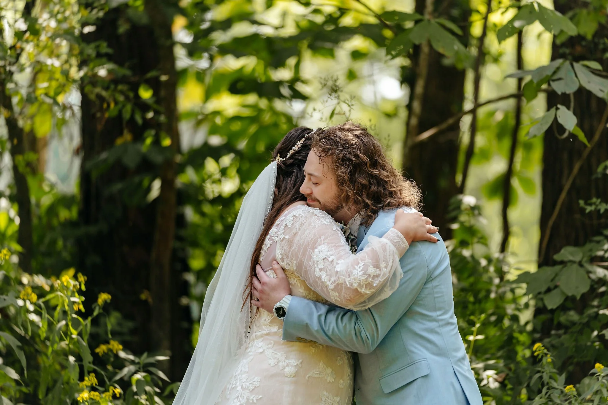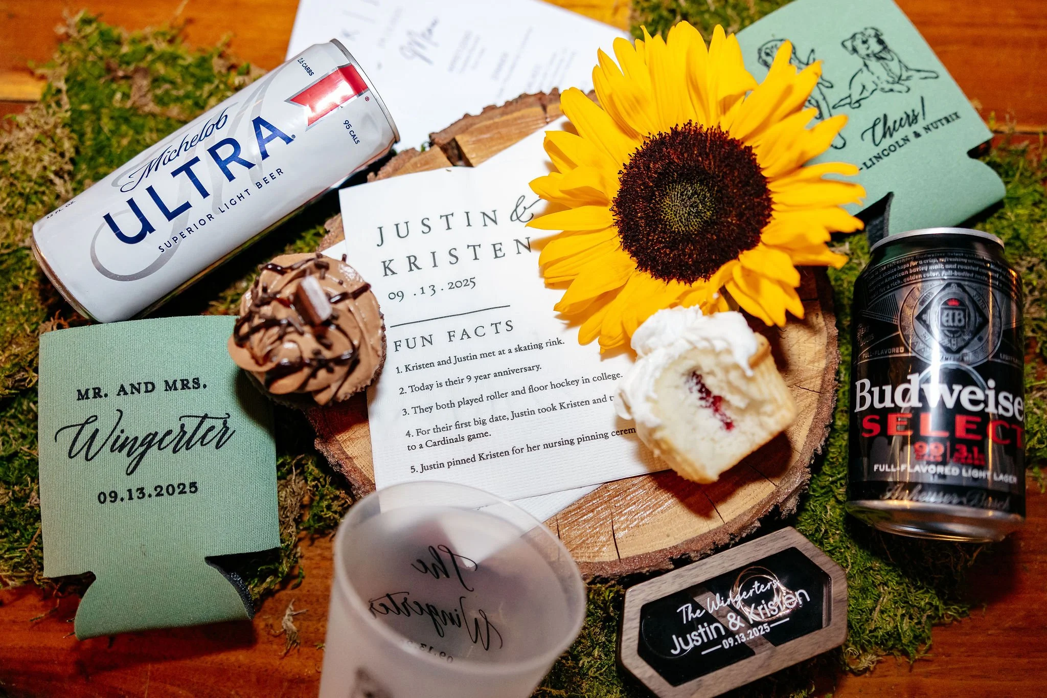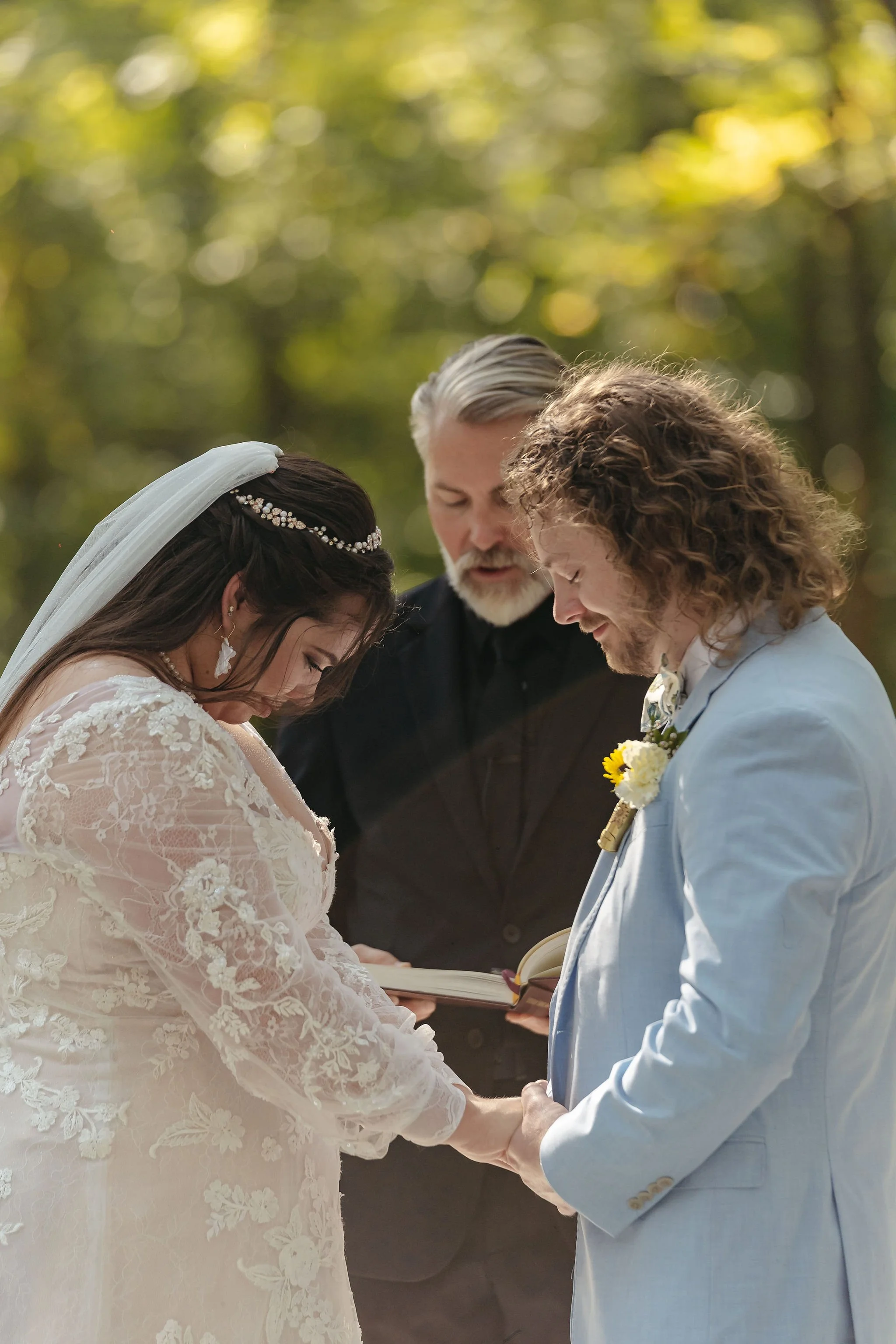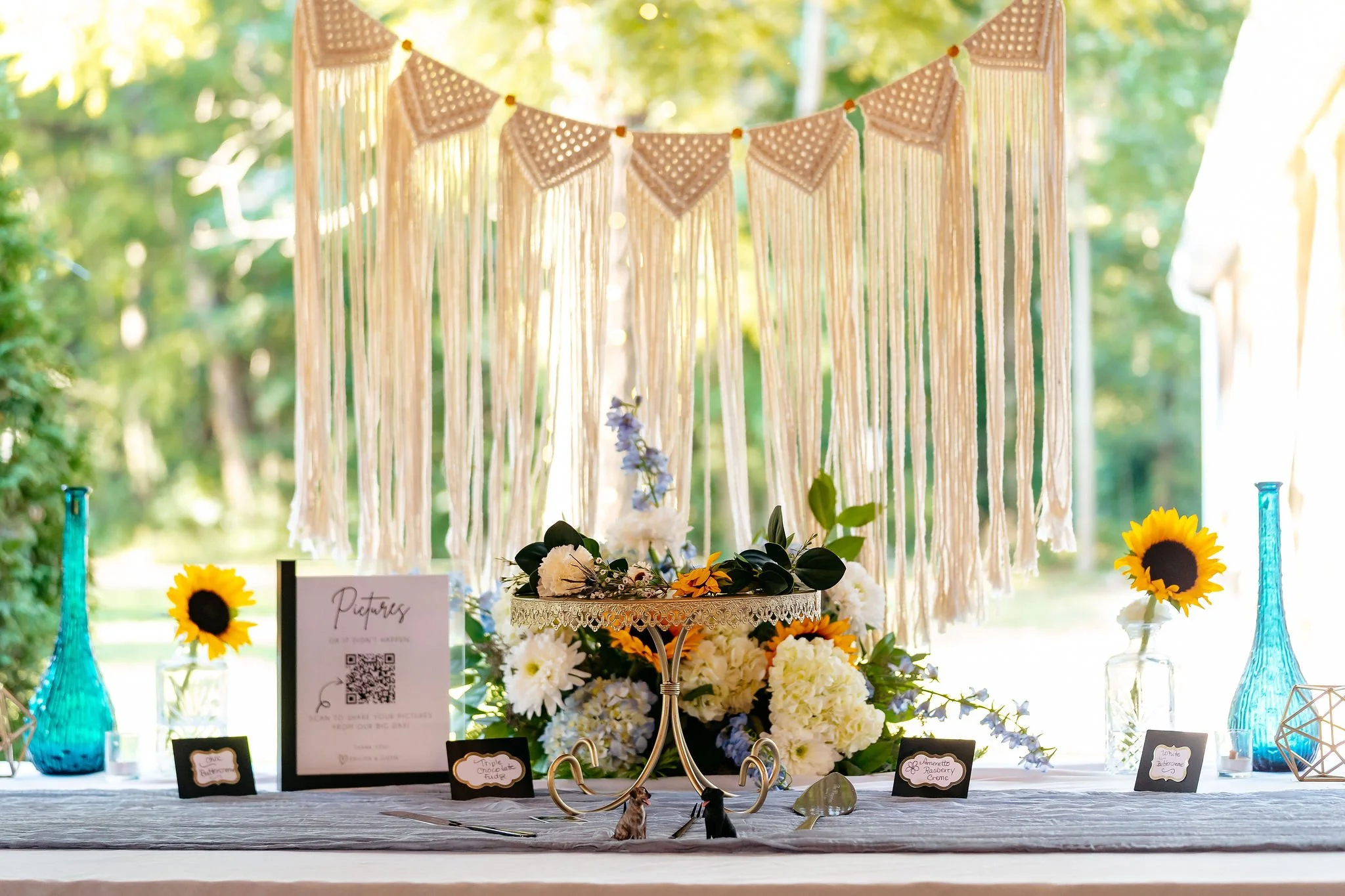 The aisle was lined with wood stumps topped with chunky vintage vases filled with sunflowers, creating a rustic and cheerful pathway to the altar. At the front stood a traditional ceremony arbor accented with florals by Cultivated Blooms, adding a soft romantic touch to the woodland setting.