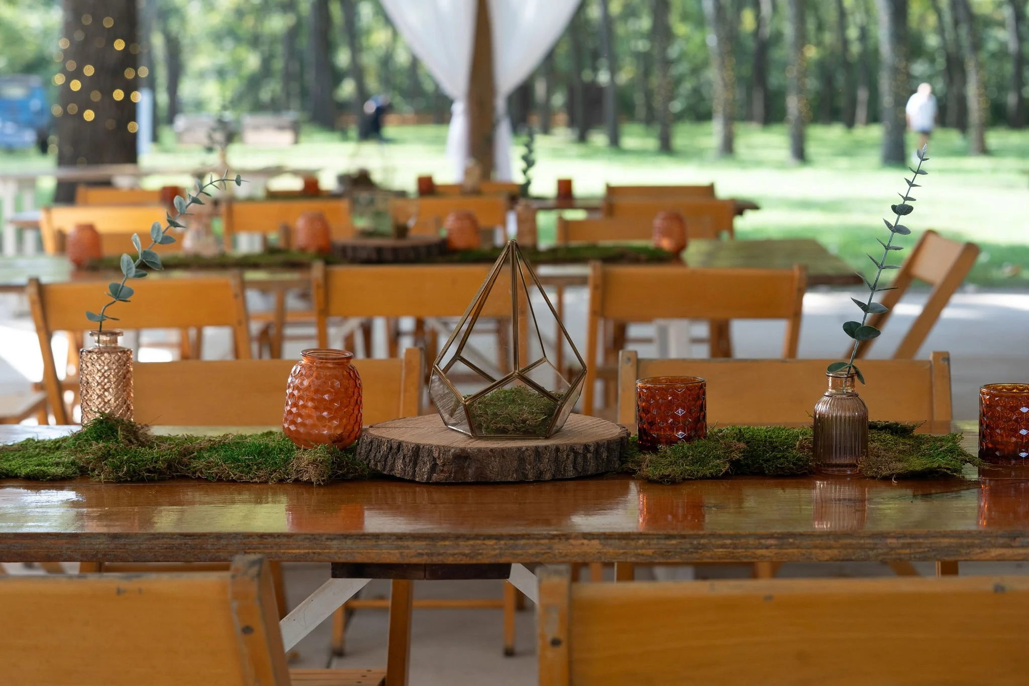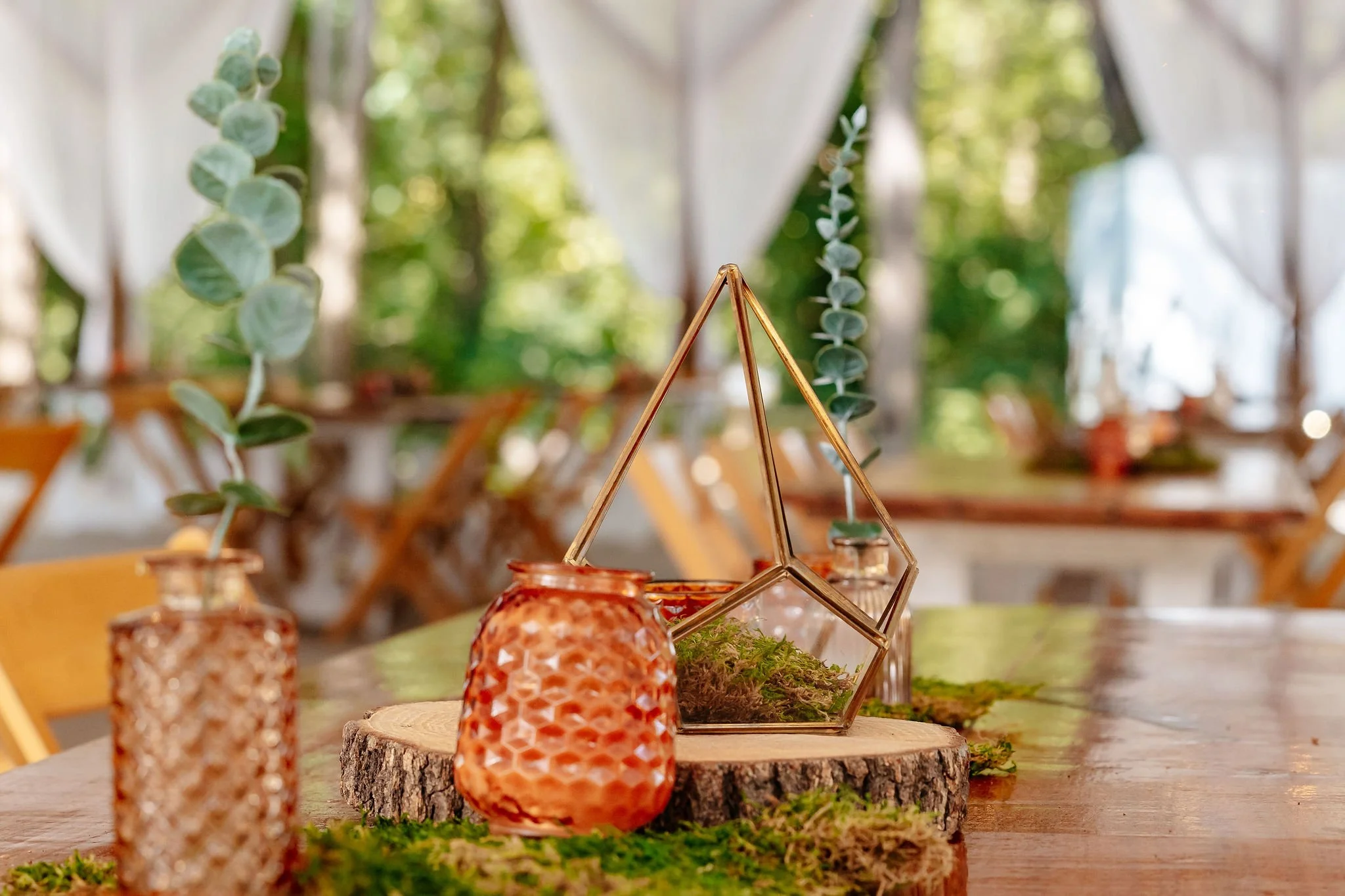 Guests entered through decorative doors framed with whiskey barrels and lanterns, a signature Lost Hill Lake look that perfectly complemented the couple’s décor palette of moss, blue, green, amber, and gold.