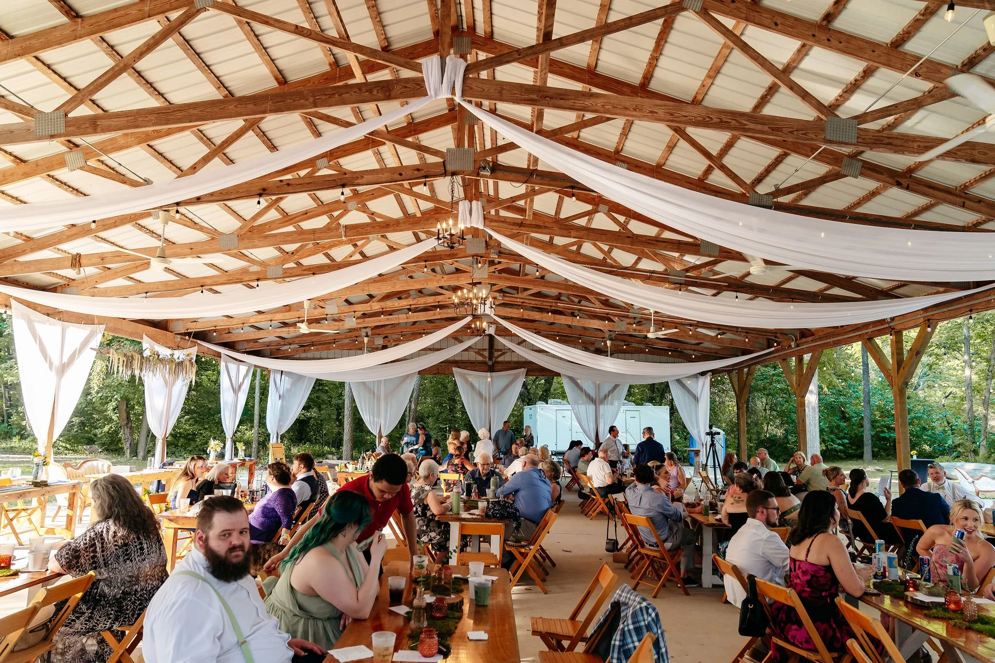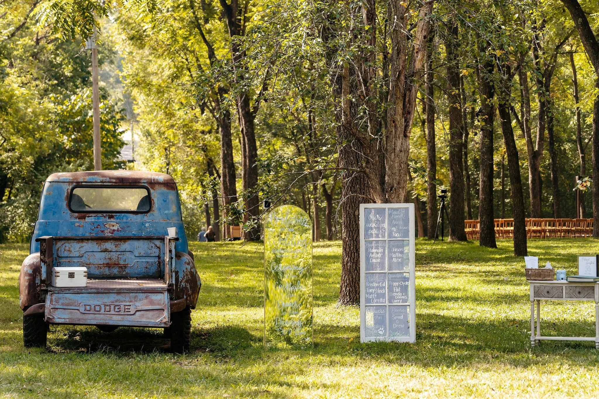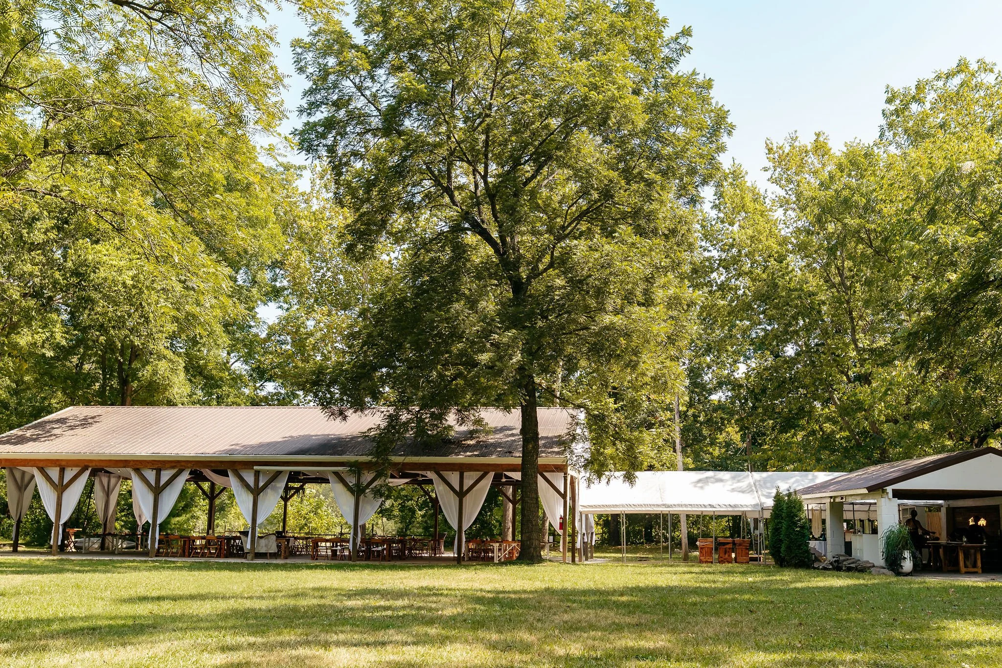 A scenic outdoor ceremony and reception space surrounded by nature